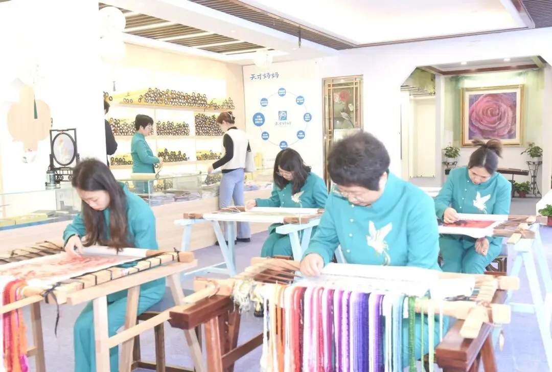 行至展厅一隅,一涵汴绣绣娘正端坐绣架前专注刺绣,银针起落间,丝线在素绢上流转生辉,引得大家纷纷驻足围观。只见绣娘们凝神静气,指尖翻飞,以针代笔,将花鸟鱼虫慢慢唤醒。有参观者轻声感叹:“原来一幅传世精品的诞生,背后是这般日复一日的专注与坚守。”这一针一线间的静默匠心,让在场者真切感受到了非遗技艺的温度与传承的力量。