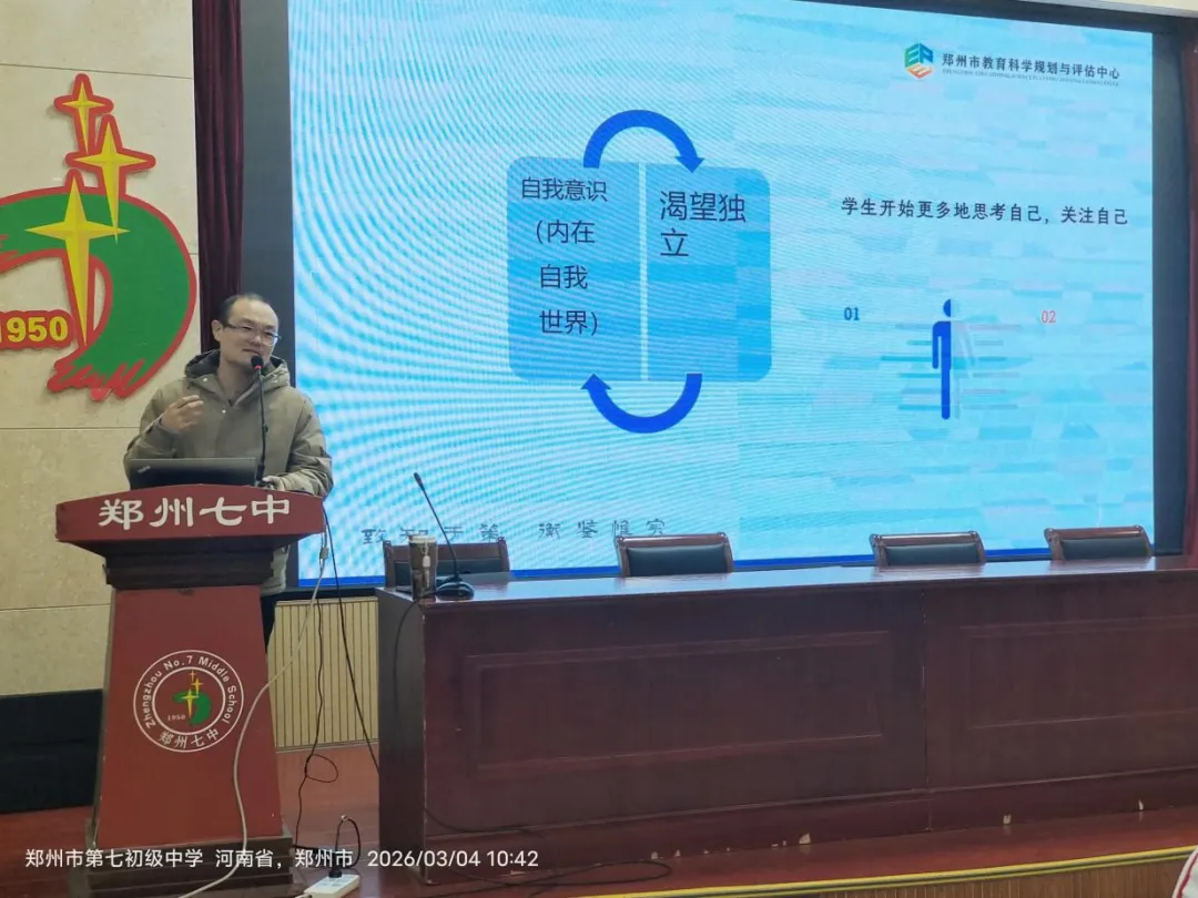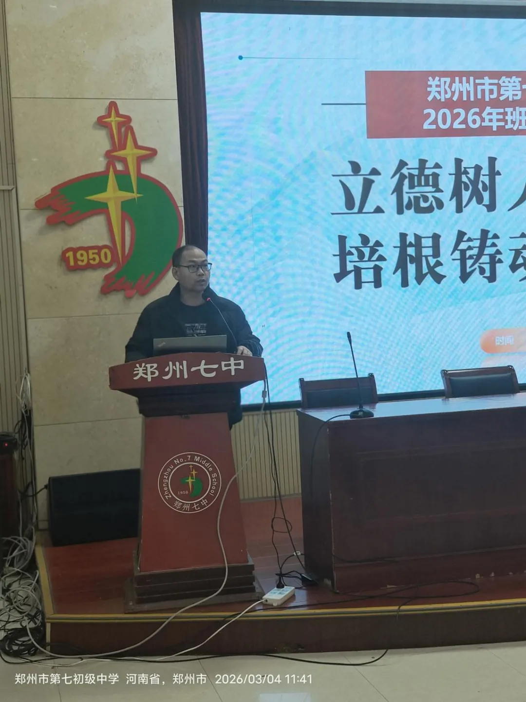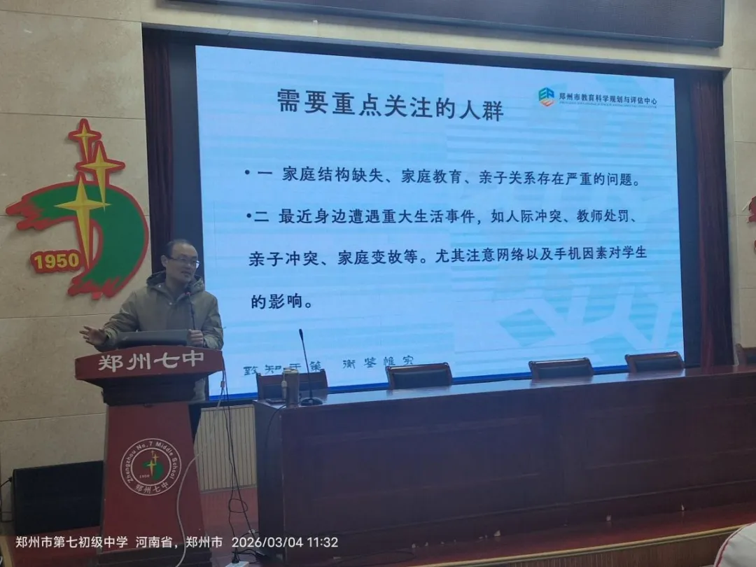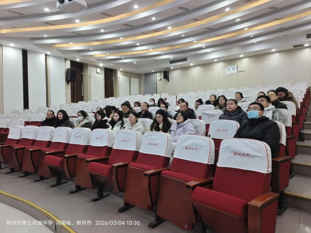 2026年3月4日,郑州市第七初级中学在报告厅召开2025-2026学年下学期班主任工作部署会。学校德育工作领导小组、各年级主任、全体班主任及学生成长中心人员参加了会议。会议由学生成长中心主任李少锋主持,郑州市教育科学规划与预评估中心保健站副站长、心理健康教研员鲁泉受邀为全体班主任作专题培训。