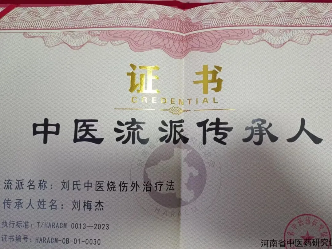 中牟县中医院中医外科主治医师刘梅杰,作为刘氏中医外科烧伤疗法第五代传承人,他不仅传承了家传秘方,又经历了大学及中医外科研究生阶段的系统学习,还先后拜河南首批优质中医学术流派张八卦外科李氏中医外科第六代传承人李中玉等全国名老中医为师,并成为该流派第七代传承人。刘梅杰集百家之所长,触类旁通,在传承的基础上进行了创新。入职中牟县中医院以来,他把刘氏中医外科烧伤疗法进一步发扬光大,开拓了中牟县中医院中医外科疾病特色治疗的先河,使中牟县中医院的中医外科从无到有,逐步壮大成为独具特色的中医品牌。刘氏中医外科烧伤疗法也被推选为中牟县第五批县级非物质文化遗产代表性项目。刘梅杰参加了河南电视台第一季《我是中医传承人》和第三季《我是中医药传承人》栏目并分别成为“优秀传承人”获得者,受到河南电视台专访及其他多家媒体的报道。他还先后被推选为“河南中医药青苗培养人才”和“郑州市名医培养项目人才”。