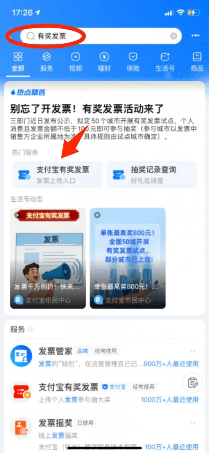 第一步:打开支付宝App,搜索【有奖发票】,点击【支付宝有奖发票-发票上传入口】进入