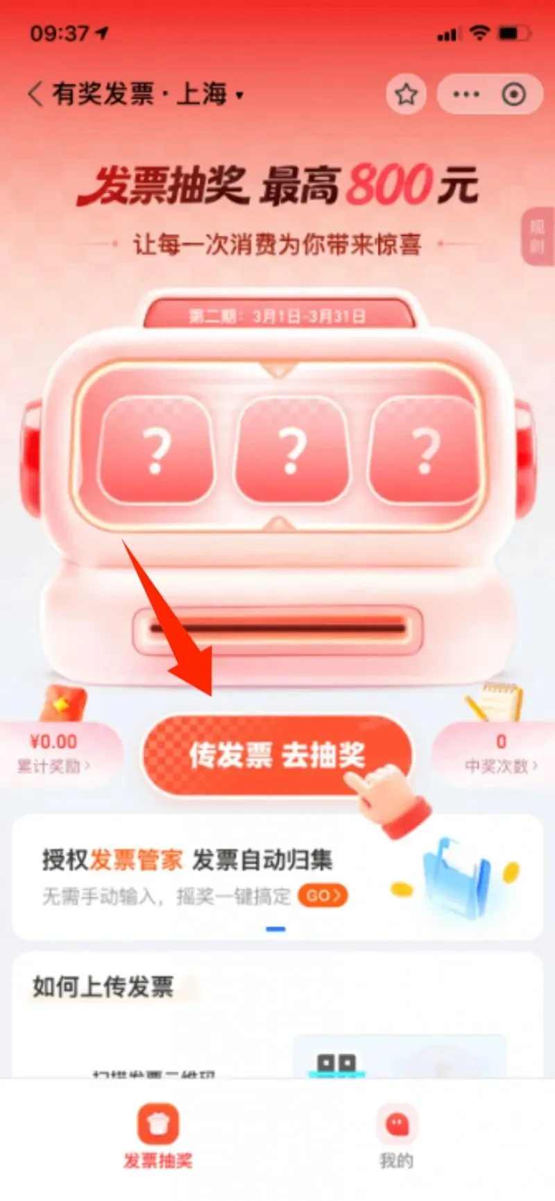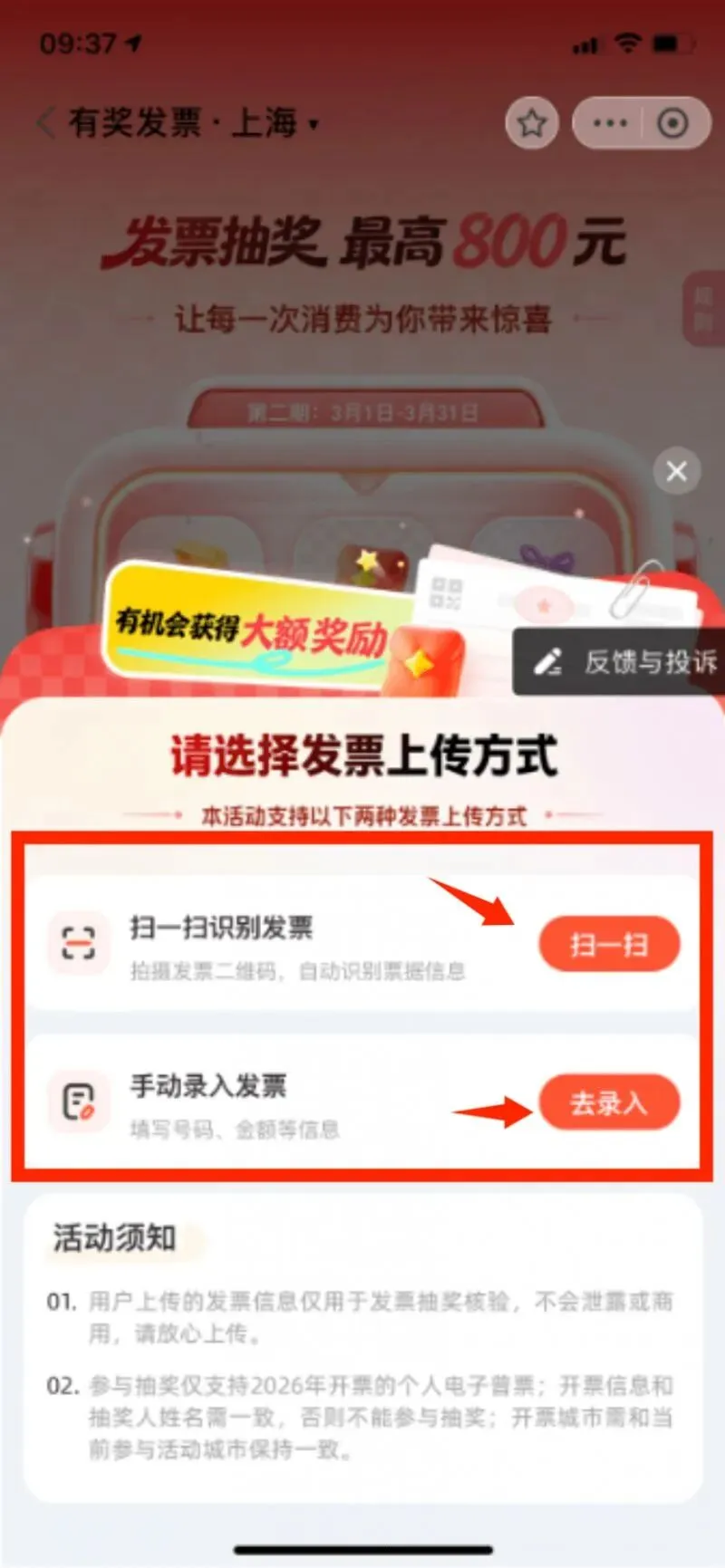 第二步:点击【传发票去抽奖】,可选择【扫一扫识别发票】或者【手动录入发票】两种方式; (手边有两台手机或者电脑的,选择扫一扫更方便,如有只有一台手机,可选择手动录入)