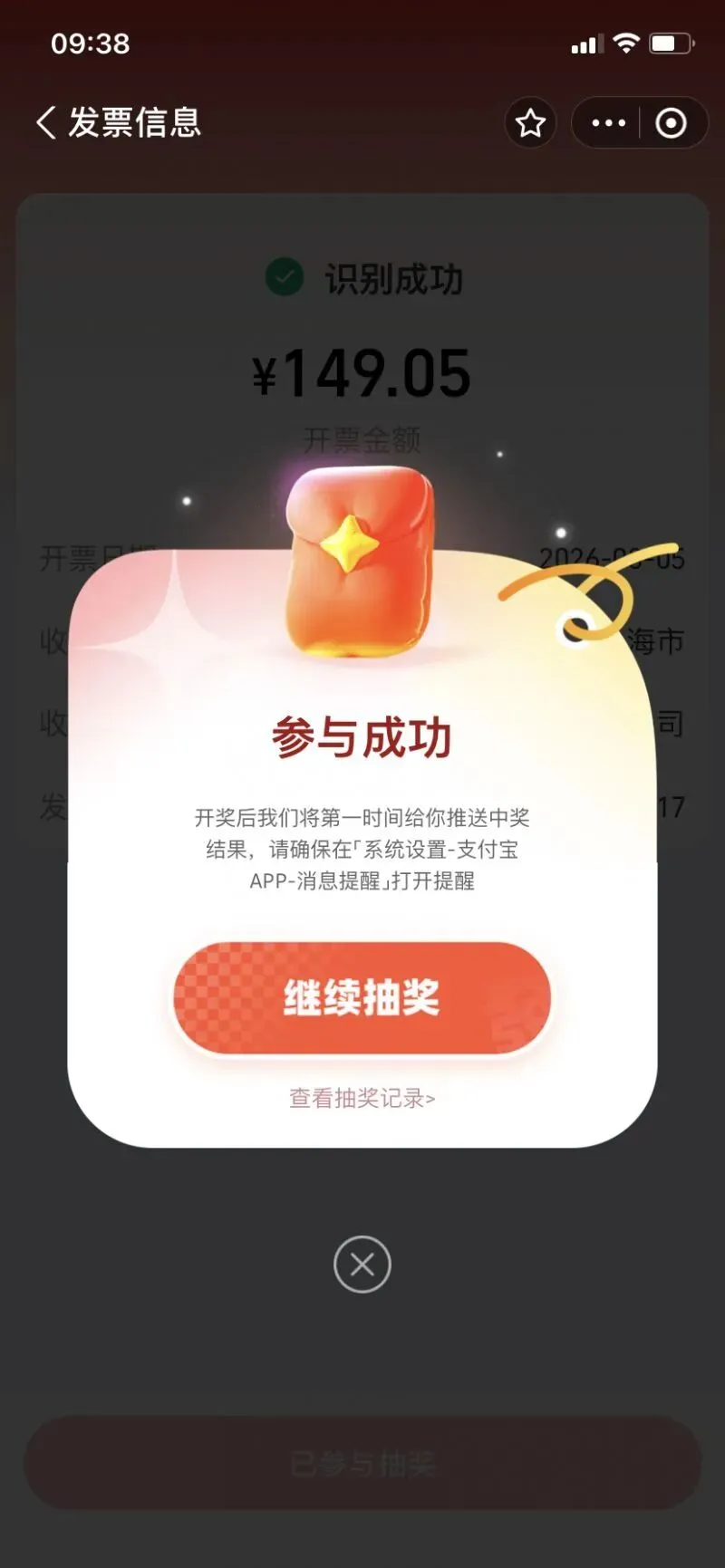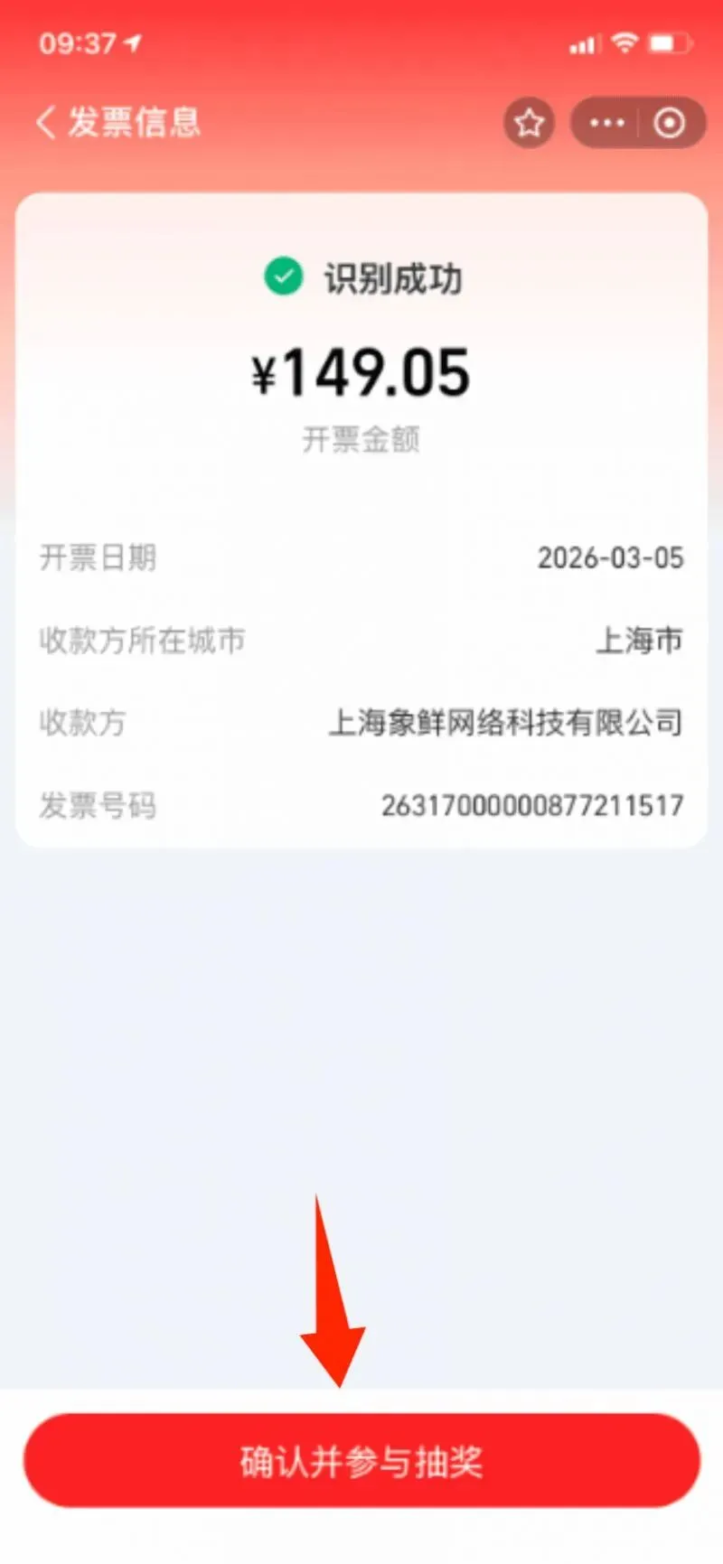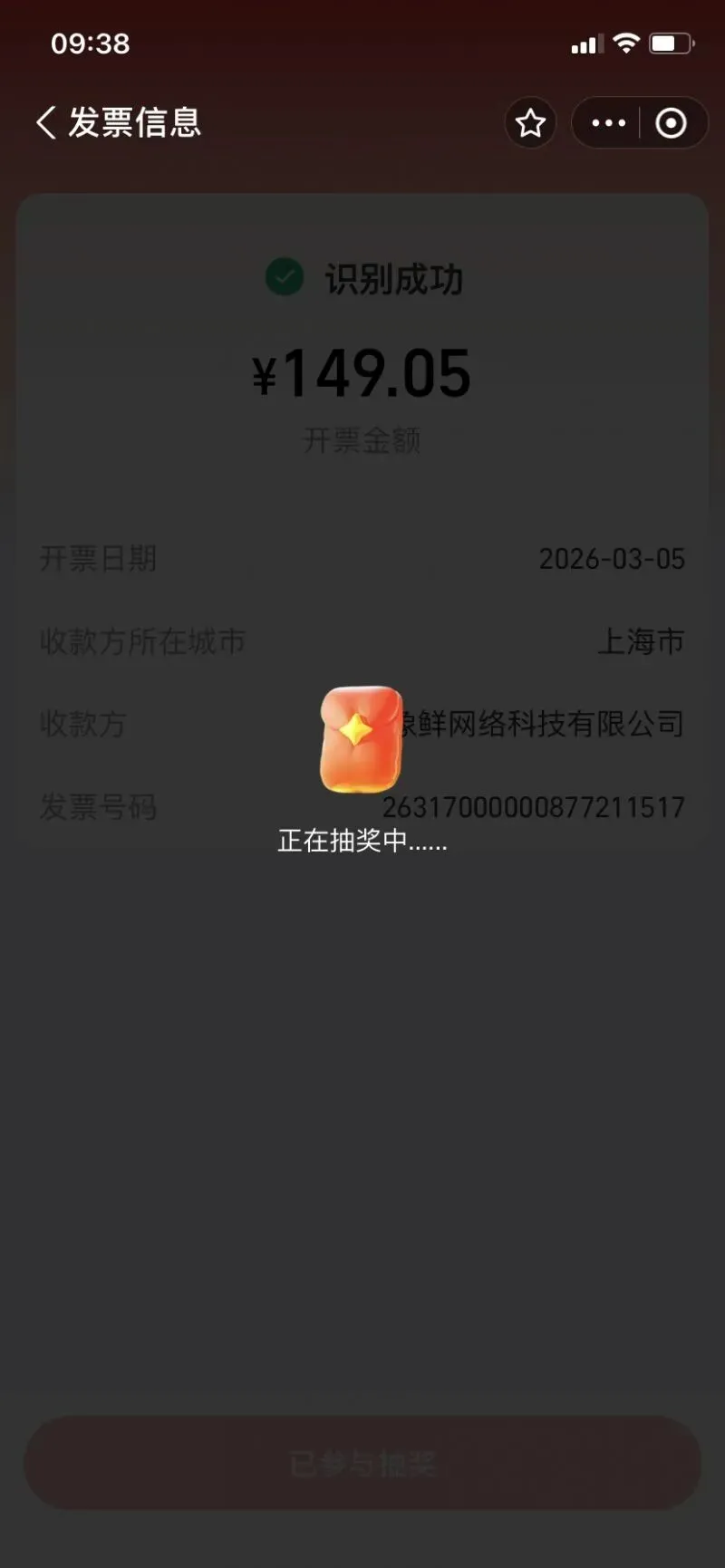 第三步:点击【扫一扫】,打开电子发票,手机拍摄发票左上角的二维码,自动识别票据信息,识别成功,点击下发的【确认并参与抽奖】