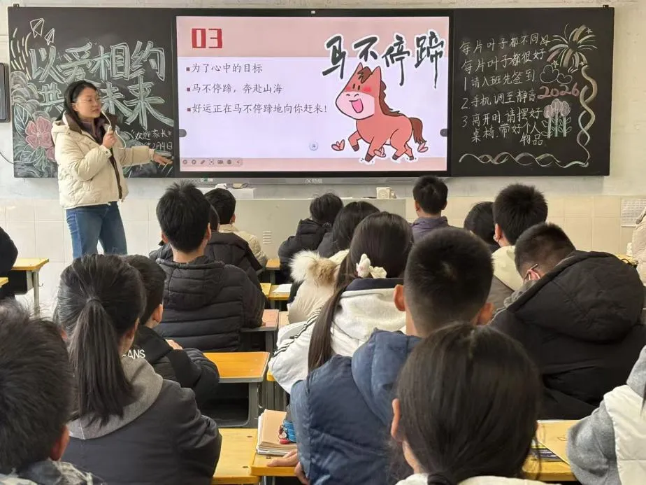 班会最后,班主任寄语全体同学:“前路山高水长,新的一年,我们一起策马扬鞭,遇见更好的自己。”希望同学们在新的学期里,既有追梦的勇气,也有脚踏实地的坚持,在属于自己的人生舞台上绽放光彩。