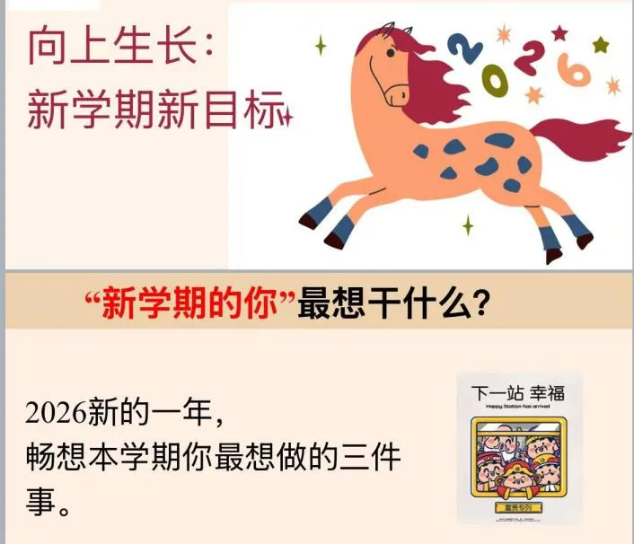 在“向上生长”环节,同学们认真思考并写下新学期最想做的三件事,并围绕长期目标与短期目标制定个性化学习计划。真正想要变好的人,不会把对成长的渴望,停留在脑海中。当你感到迷茫时,不妨静下心来做好这几件事。班主任引导大家从时间管理、卫生习惯、情绪调节、心态建设等方面入手,帮助同学们在新学期中“甩掉马马虎虎,迎接龙马精神”。