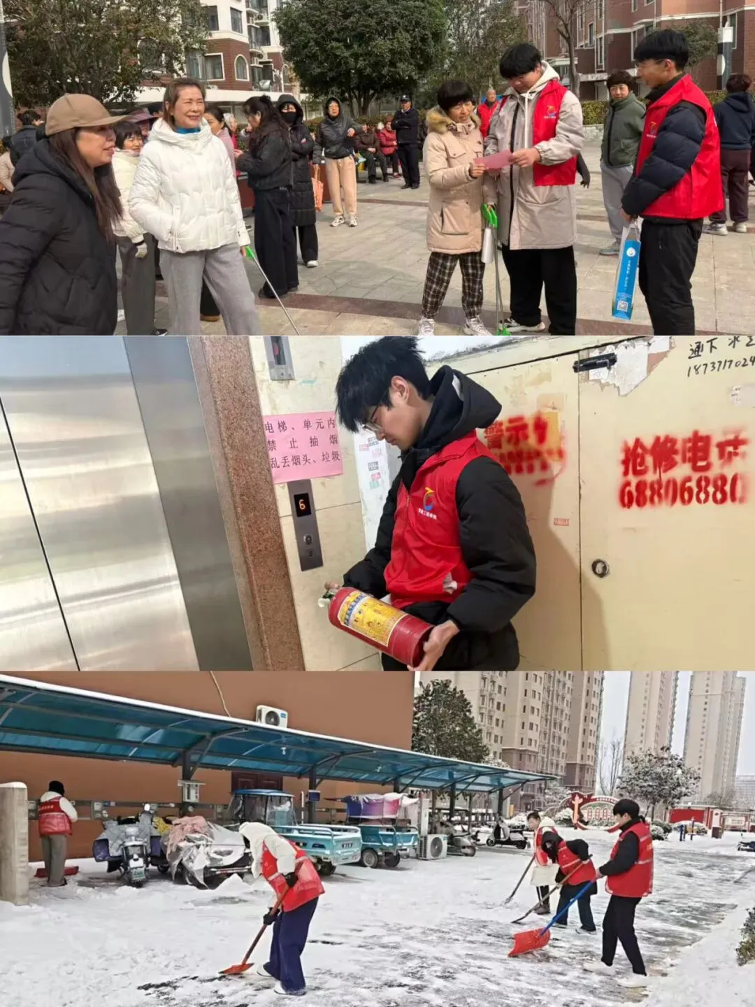 活动前期,智能工程学院充分结合寒假时间安排和冬季安全工作重点,成立专项活动小组,明确活动目标、责任分工和安全注意事项。志愿者团队主动与宁馨苑小区物业开展对接,针对性制定活动方案,备足铁锹、扫帚、防火宣传手册等物资。活动期间,扫雪除冰组聚焦小区主干道、单元门口、老年活动区等关键部位,分工协作、默契配合,挥舞铁锹铲除坚冰、手持扫帚清扫积雪,反复清扫压实,全力清除居民出行障碍。防火宣传组化身“消防安全宣传员”, 全方位普及冬季防火知识,志愿者协助小区物业对辖区内消防栓、灭火器等消防设施进行全面排查,详细检查设施完好情况及有效期。