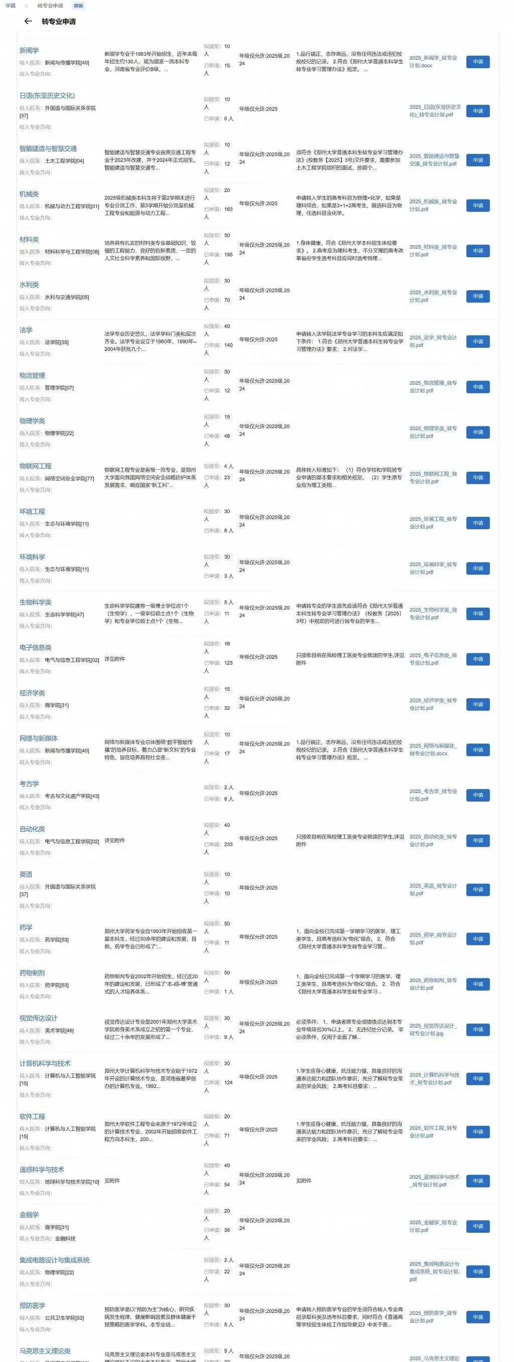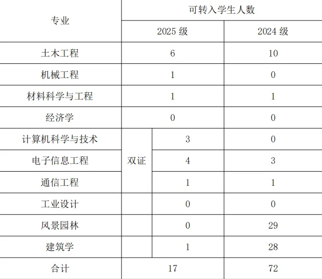 2.2024级、2025级经济学、材料科学与工程、土木工程、机械工程四个单证专业学生,可申请转入同级尚有空缺名额的单证专业(音乐表演专业除外)。