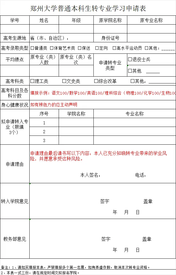 3.2025级延长学习时间(留级)的学生转专业需向学院提交《郑州大学普通本科生转专业学习申请表》(附件1)线下报名,请将申请表连同相关证明材料(一式两份)于2026年3月3日18:00前交至学院教学办公室(南校区行政楼228办公室)。