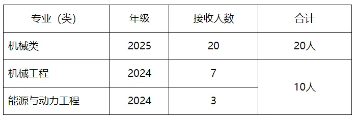 2025级机械类拟接收其他学院学生20人,2024级机械工程专业拟接收其他学院学生7人,能源与动力工程专业拟接收其他学院学生3人,其他年级不接收转专业学生。如下表所示: