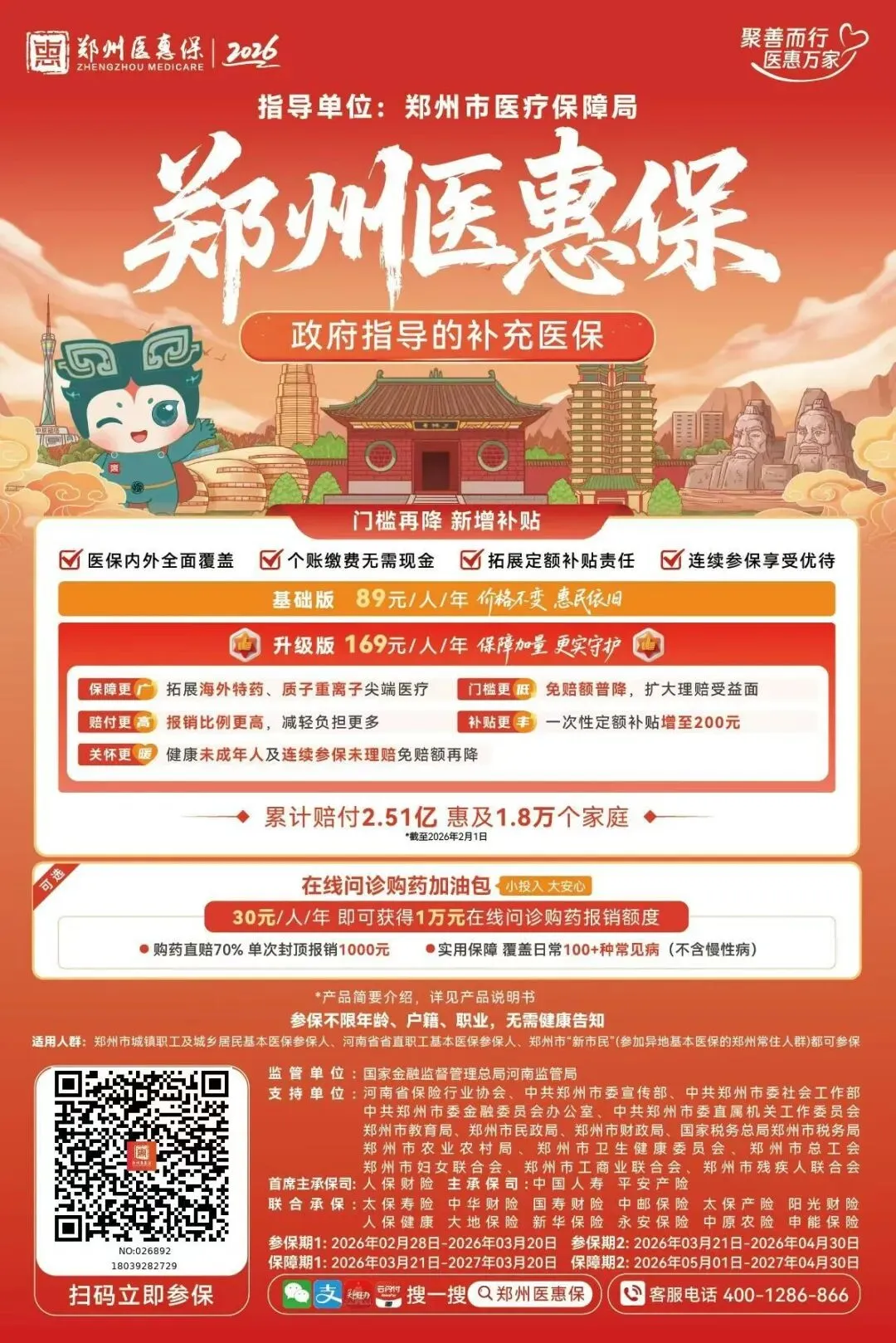 凡是正常参加郑州市城乡居民基本医疗保险且完成保费缴纳的人员,均可享受门诊统筹、高血压糖尿病专项门诊、门诊慢特病、住院(含生育)基础医保报销,同时享有大病保险、医疗救助双重兜底保障。其中,基本医保年度最高可报销15万元,大病保险年度最高赔付40万元,两项叠加年度保障额度可达55万元,全方位减轻就医经济压力。