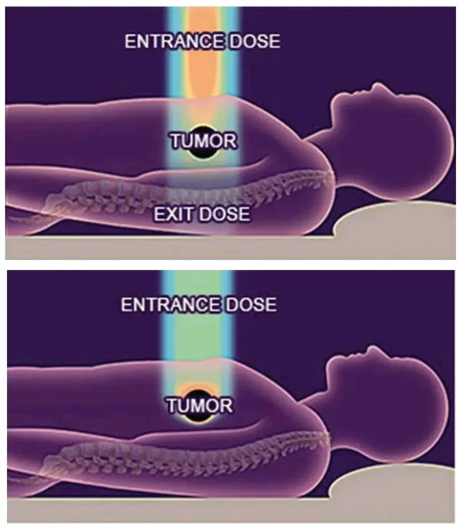 传统放疗如同大范围轰炸,X射线与伽马射线穿过人体时,会损伤肿瘤前后的正常组织,到达病灶时能量已大幅衰减,治疗效果与副作用难以兼顾。