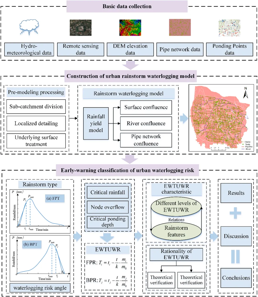关系分析与验证: 分析了不同降雨历时下,FPR和BPR的WRA值分布规律,以及EWTUWR与暴雨特征(如峰前暴雨强度FPRI、总降雨量TRV)之间的相关关系。最后,通过理论验证(与中国《气象灾害防御条例》规定的避险时间对比)和实际验证(与实测内涝数据对比),证明了所提出预警时间计算方法的合理性和适用性。