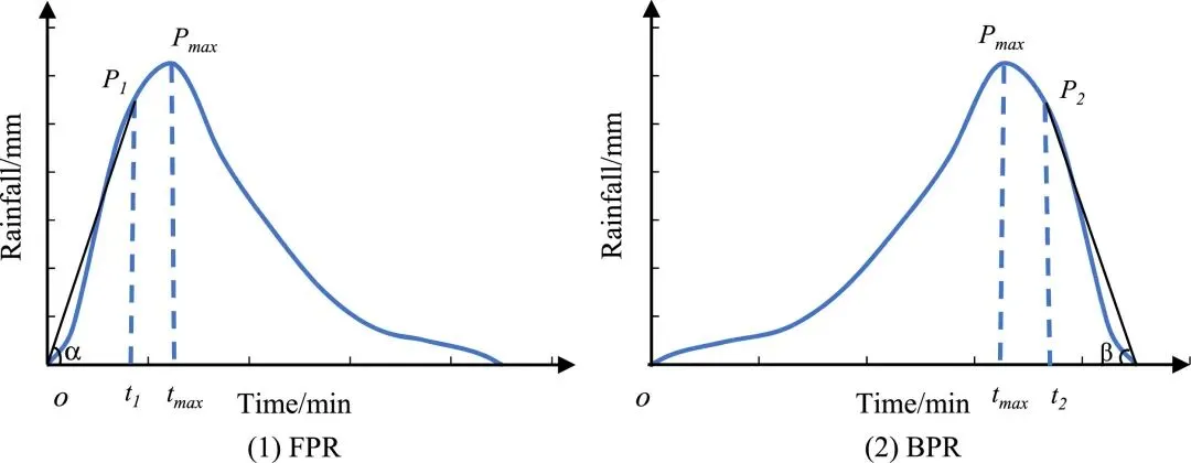 水涝风险角(WRA)的提出与计算: 研究提出了WRA的概念,定义为降雨过程中临界降雨量(CR)与水平时间轴之间的夹角。通过降雨峰现系数区分峰前暴雨(FPR)和峰后暴雨(BPR),并分别用其WRA值的正切函数进行计算。