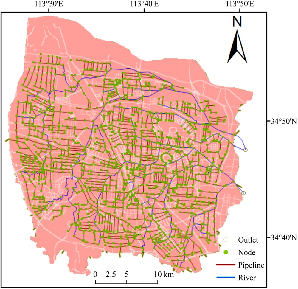 模型构建与验证: 首先,选取中国郑州市中心城区五个区为研究区,收集了水文气象数据(降雨、积水点)、下垫面数据(土地利用、高程)和管网数据。利用这些数据构建了耦合一维管网与二维地面积水的InfoWorks ICM模型,模拟暴雨内涝演变过程。模型采用了SWMM进行地表汇流计算,用圣维南方程组全解模拟管网水流,并用二维有限体积法求解地表漫流。研究使用多场历史暴雨对模型参数进行了率定和验证,采用纳什效率系数(NSE)和洪峰流量误差(PFE)评估模型精度,结果显示模型模拟精度较高,可用于后续分析。