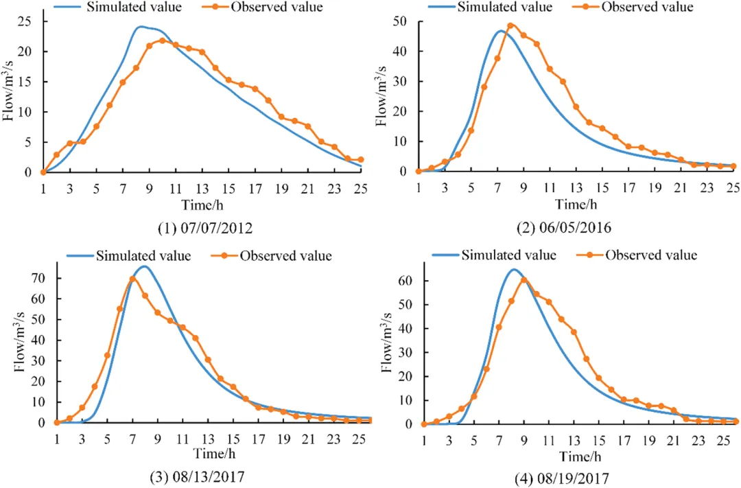Fig. 8. 不同降雨事件下参数率定与验证的流量模拟结果