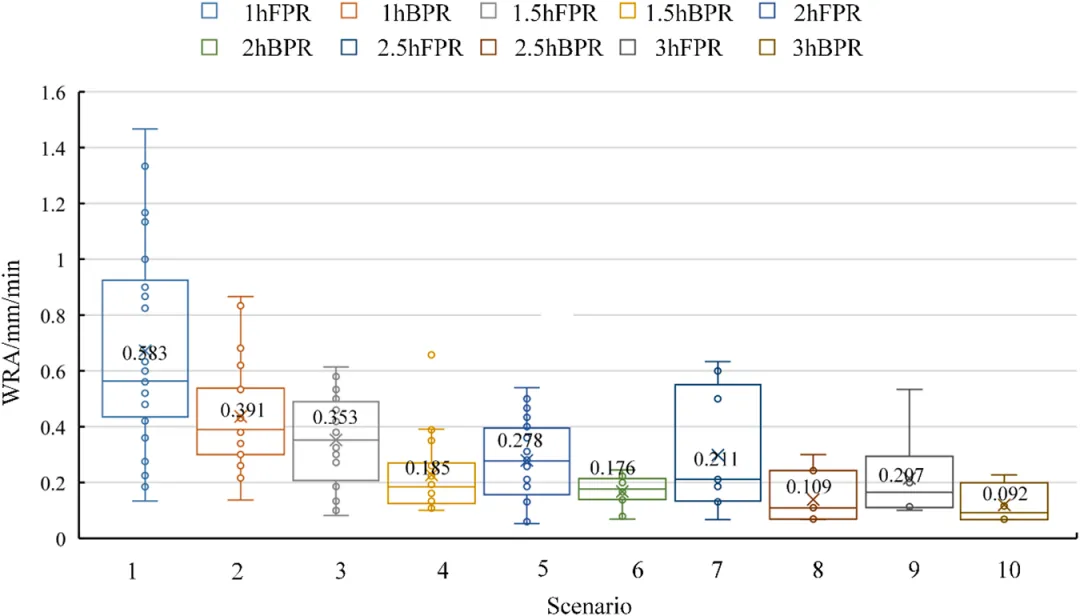 关于水涝风险角(WRA): WRA值能够结合降雨特征与内涝特性反映水涝灾害风险的形成。随着降雨历时的增加,WRA值逐渐减小。与BPR相比,FPR的降雨更集中,对应的WRA值更大,因此更易形成水涝灾害。