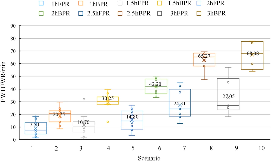 Fig. 12. 不同情景下Ⅱ级预警的城市水涝风险预警时间箱线图