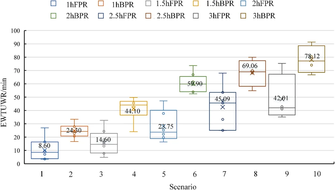 不同情景下,Ⅰ级和Ⅱ级的平均EWTUWR随降雨历时延长而增加,且Ⅱ级的平均预警时间更长。其中,1小时降雨历时对应的平均EWTUWR最小。