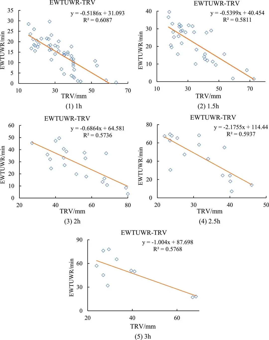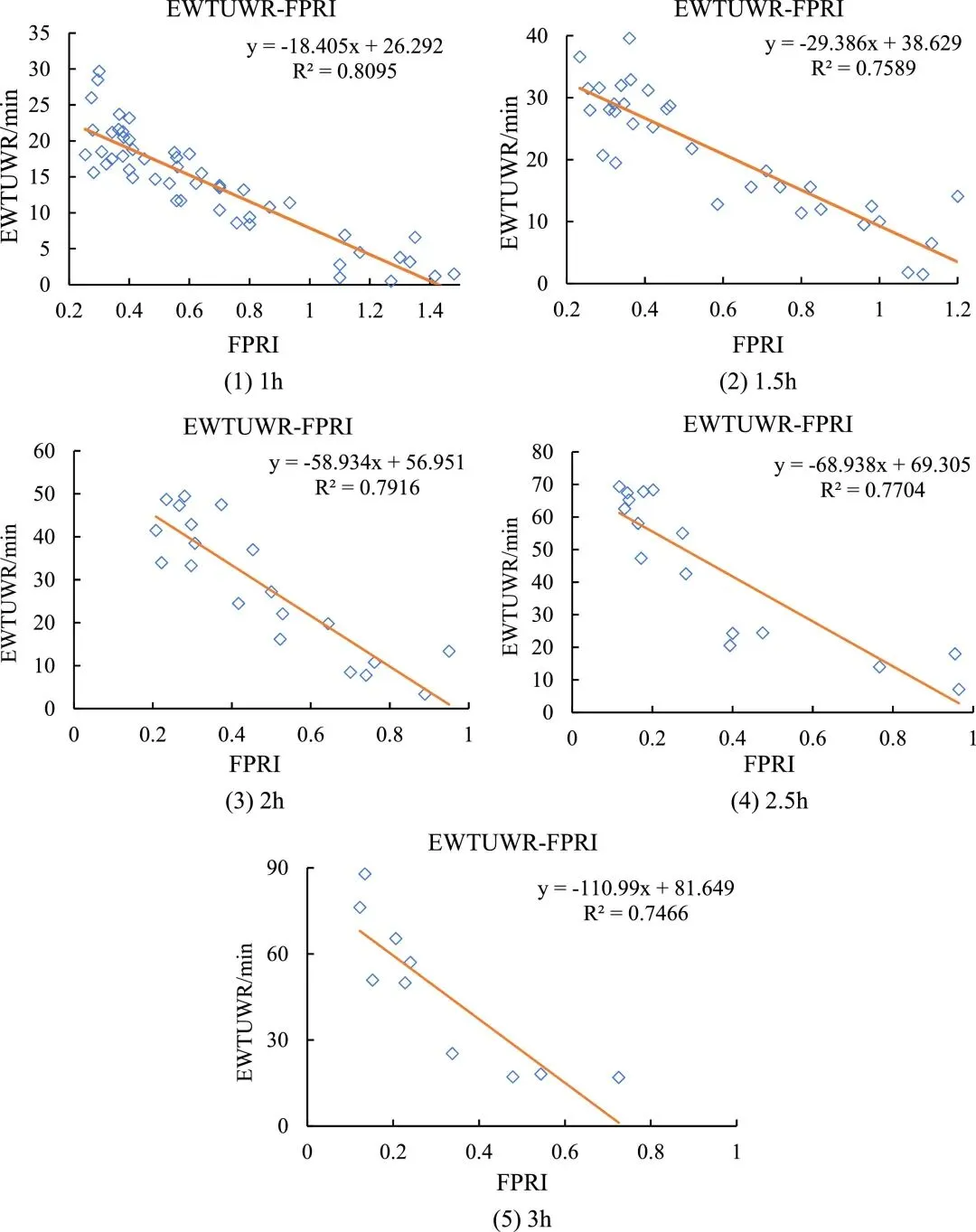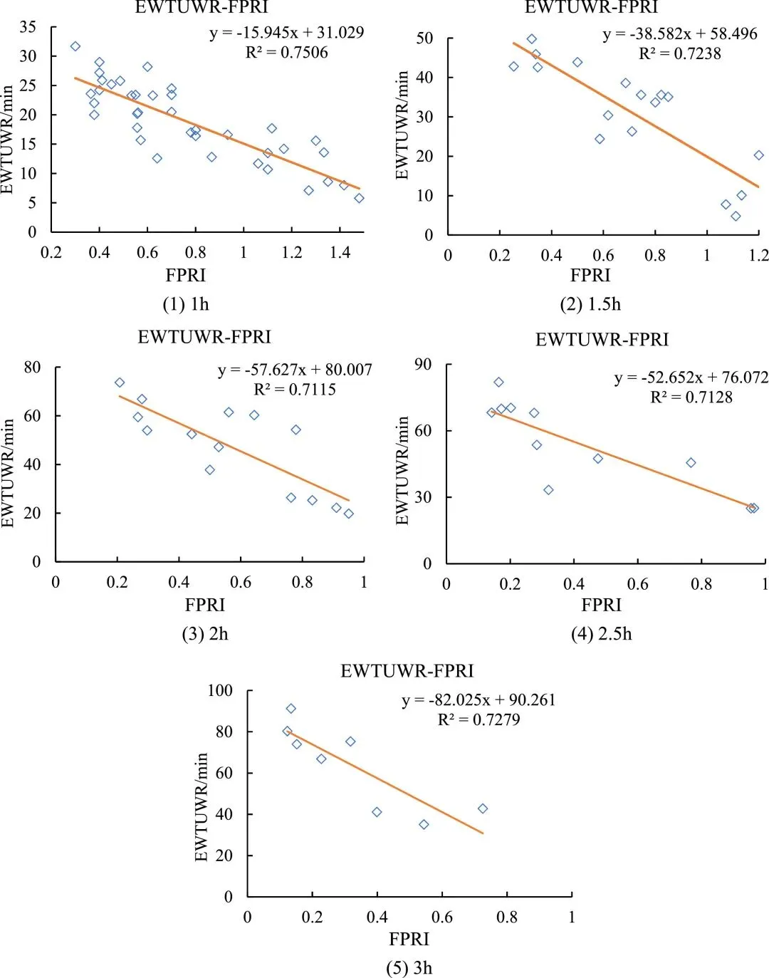 关于预警时间与暴雨特征的关系:Ⅰ级和Ⅱ级EWTUWR与降雨峰现位置、峰前暴雨强度(FPRI)和总降雨量(TRV)密切相关。随着FPRI和TRV的增加,对应的EWTUWR会缩短(预警提前)。其中,FPRI对EWTUWR的影响更大(相关性系数更高),而TRV的影响相对较小。