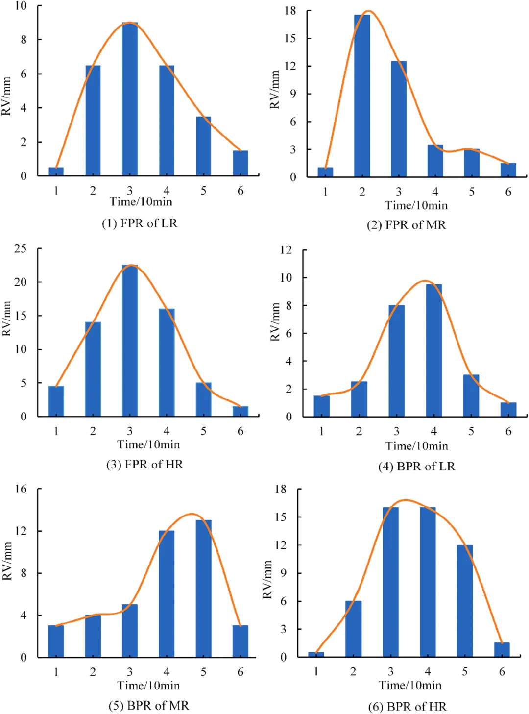 Fig. 17. 用于验证的6场1小时历时暴雨事件每10分钟降雨量分布