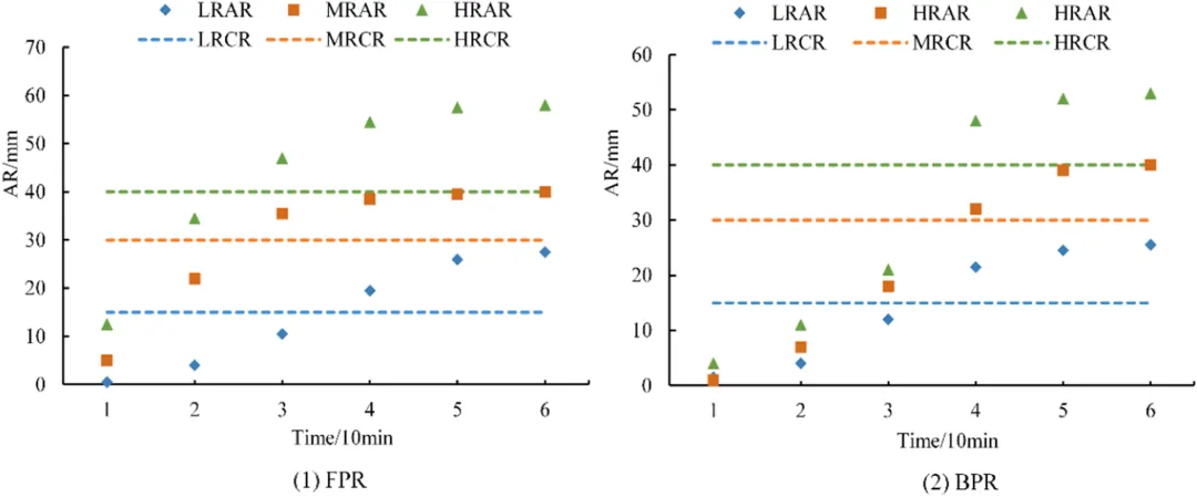 相同历时下,FPR的Ⅰ级和Ⅱ级平均EWTUWR均小于BPR。这是因为FPR的降雨峰现位置相对靠前,降雨更集中,能更快达到峰现降雨量,导致管网排水能力不足,因此内涝风险更高,预警时间更早,避险时间更短。