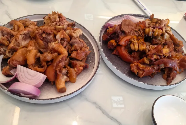 必做项:一定要尝尝“塔桥猪蹄”。那是用老卤慢炖出来的,皮色红润,筷子一戳就破,抿一口,胶质黏嘴,却不腻人。