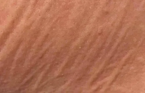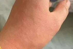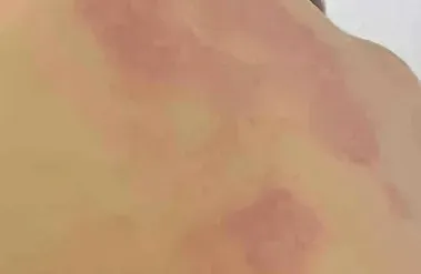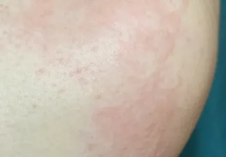 初起时风团是粉红色斑,很快水肿隆起,变为大小不一的风团,由于水肿的压迫和较小动脉的收缩,风团中心变成黄白色,用两个手指捏皮损,则有典型皮样外观。