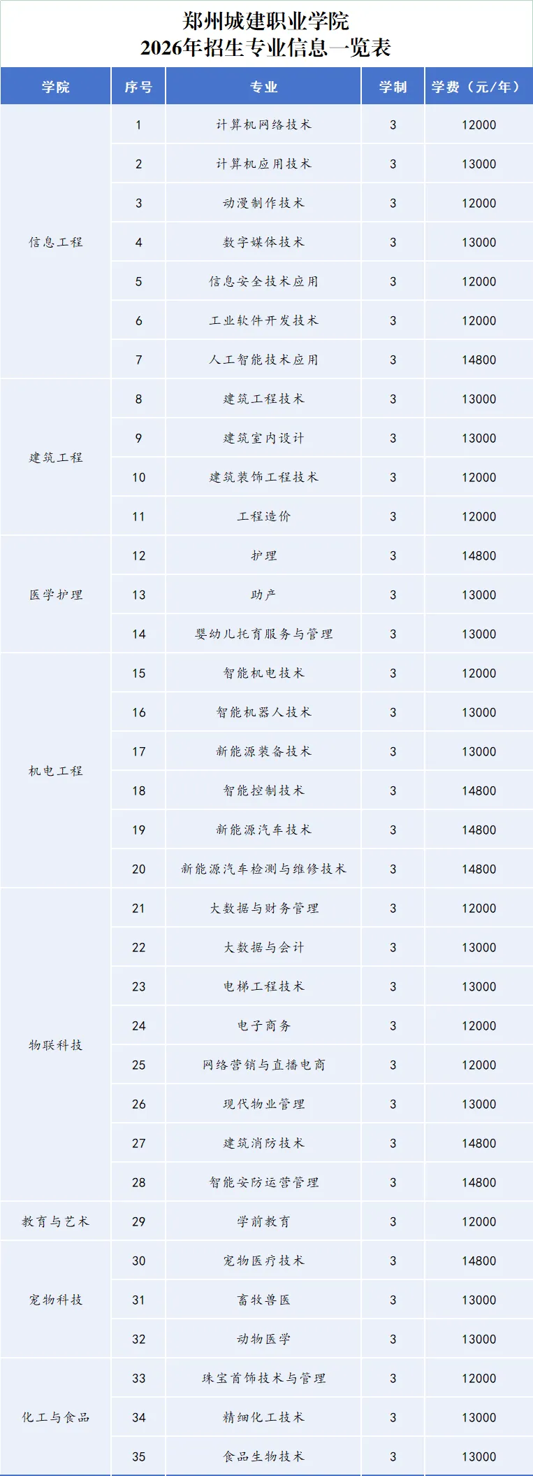 2026年招生专业信息一览表: