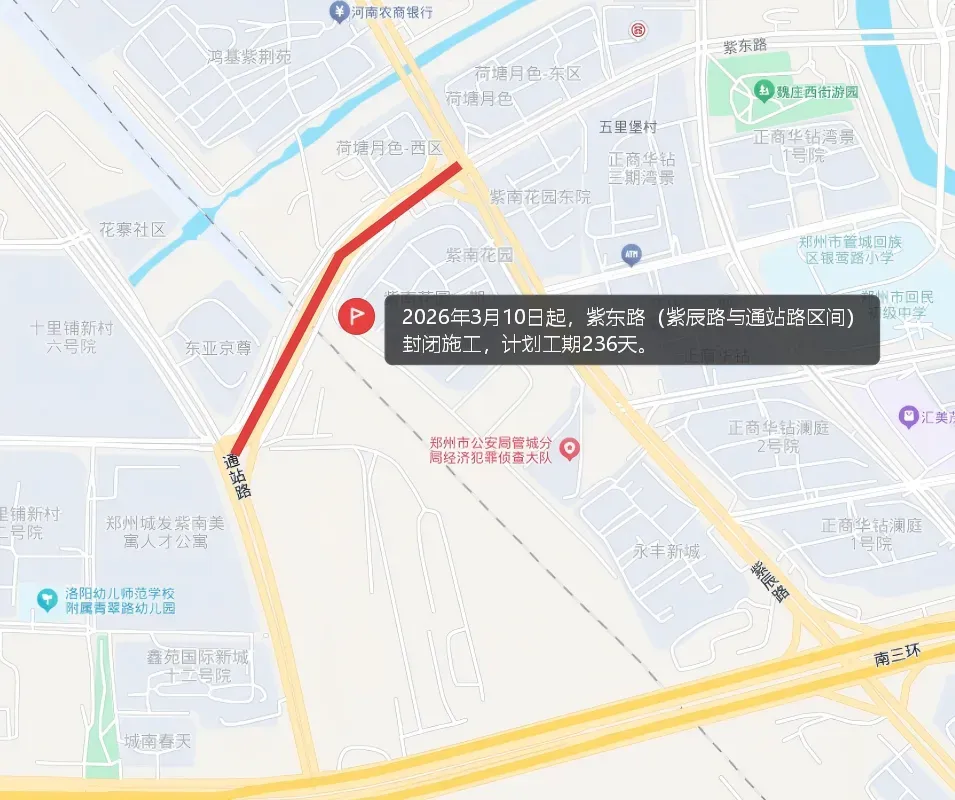 根据新建郑州南站及相关工程跨紫东路项目施工需求,紫东路(紫辰路与通站路区间)从2026年3月10日开始进行施工,工期236天,郑州交警提醒过往行人、车辆减速慢行。