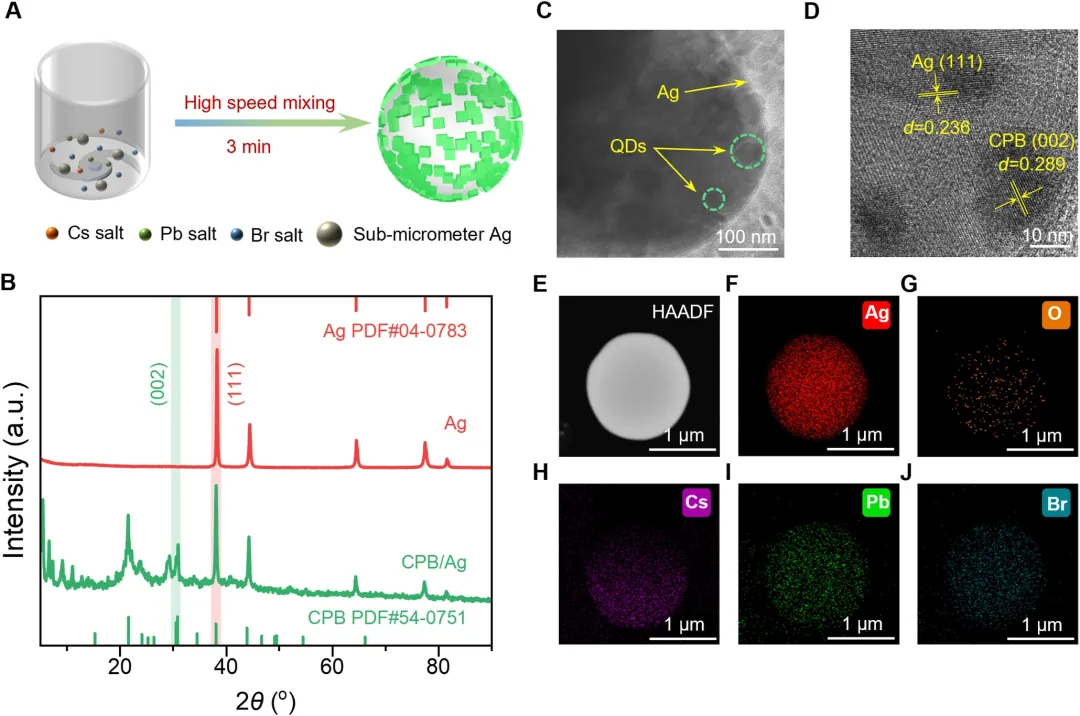 图1 | 结构表征。(A) CPB /Ag混合荧光粉制备工艺示意图。(B)银粉与 CPB /Ag混合粉 XRD 形貌。(C) CPB /Ag混合荧光粉的TEM图像及(D) HRTEM 图像。(E-J) CPB /Ag混合荧光粉的 HAADF 图像及元素分布图。