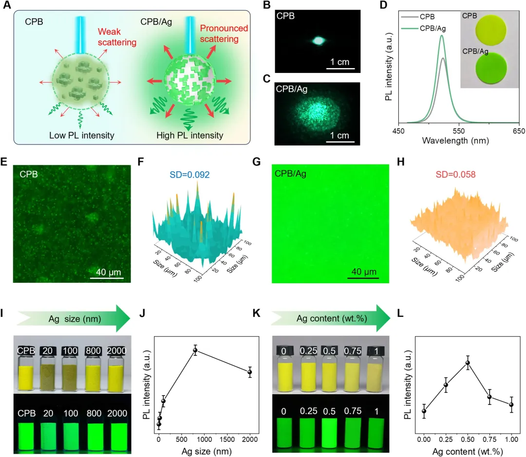 图2 | 基于银颗粒光散射的PL强度改进。(A) CPB 与 CPB /Ag荧光粉的光散射示意图。(B) 365 nm激光照射下 CPB 与(C) CPB /Ag荧光粉的显微照片。(D) CPB 与 CPB /Ag荧光粉的PL光谱。插图为 CPB 与 CPB /Ag荧光粉的日光照片。(E,G) CPB 与 CPB /Ag荧光粉的显微荧光图像及(F,H) PL分布图。(I) 不同银粒径 CPB /Ag荧光粉在日光(上)与365 nm紫外光照射(下)下的显微照片。(J) 银粒径与PL强度的关系。(K) 不同银含量 CPB /Ag荧光粉在日光(上)与365 nm紫外光照射(下)下的显微照片。(L) 银含量与PL强度的关系。