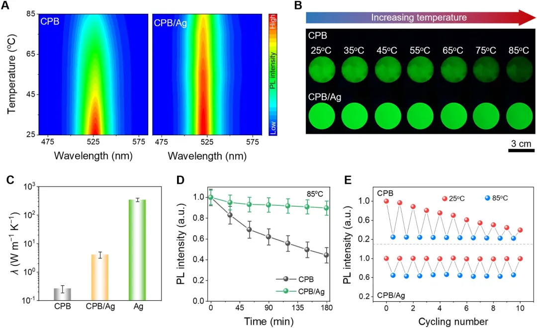 图3 | 基于银颗粒热导率的热稳定性改进。(A) CPB 和 CPB /Ag荧光粉温度依赖性光致发光光谱的彩色等值线映射。(B) CPB 和 CPB /Ag荧光粉样品从25°C加热至85°C(温度间隔10°C)的光致发光照片。(C) CPB 、银及 CPB /Ag样品的热导率。(D) CPB 和 CPB /Ag荧光粉在85°C下热老化180分钟时的光致发光强度衰减。(E) CPB 和 CPB /Ag荧光粉在25°C至85°C之间进行10次加热与冷却循环。 CPB /Ag荧光粉采用0.5 wt%的800纳米银颗粒制备。
