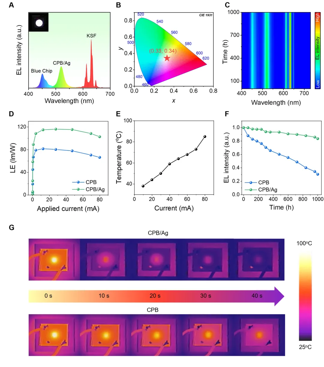图4 | 钙钛矿型pc-WLEDs性能表现。(A)由绿色发光 CPB /Ag与红色发光 KSF 荧光粉组成的 WLED 器件的EL光谱。插图为该 WLED 器件的对应照片。(B) WLED 器件EL光谱随时间变化的CIE色度图及(C)色度等值线图。(D) CPB 与 CPB /Ag基WLEDs的发光效率-电流关系。(E) WLED 器件的温度-电流关系。(F) CPB 与 CPB /Ag基WLEDs的EL强度随工作时间变化关系。(G)冷却过程中 CPB 与 CPB /Ag基WLEDs的红外热成像,其中心芯片温度被实时监测。