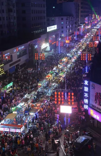 晚上的夜市、街边小摊,人挤人,烤冷面、炒凉粉、臭豆腐、糖炒栗子,香气飘一条街。