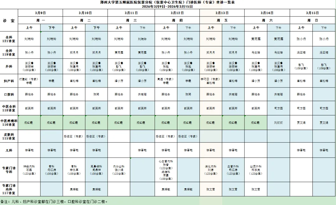 2026年3月9日-2026年3月15日门诊医师排班表