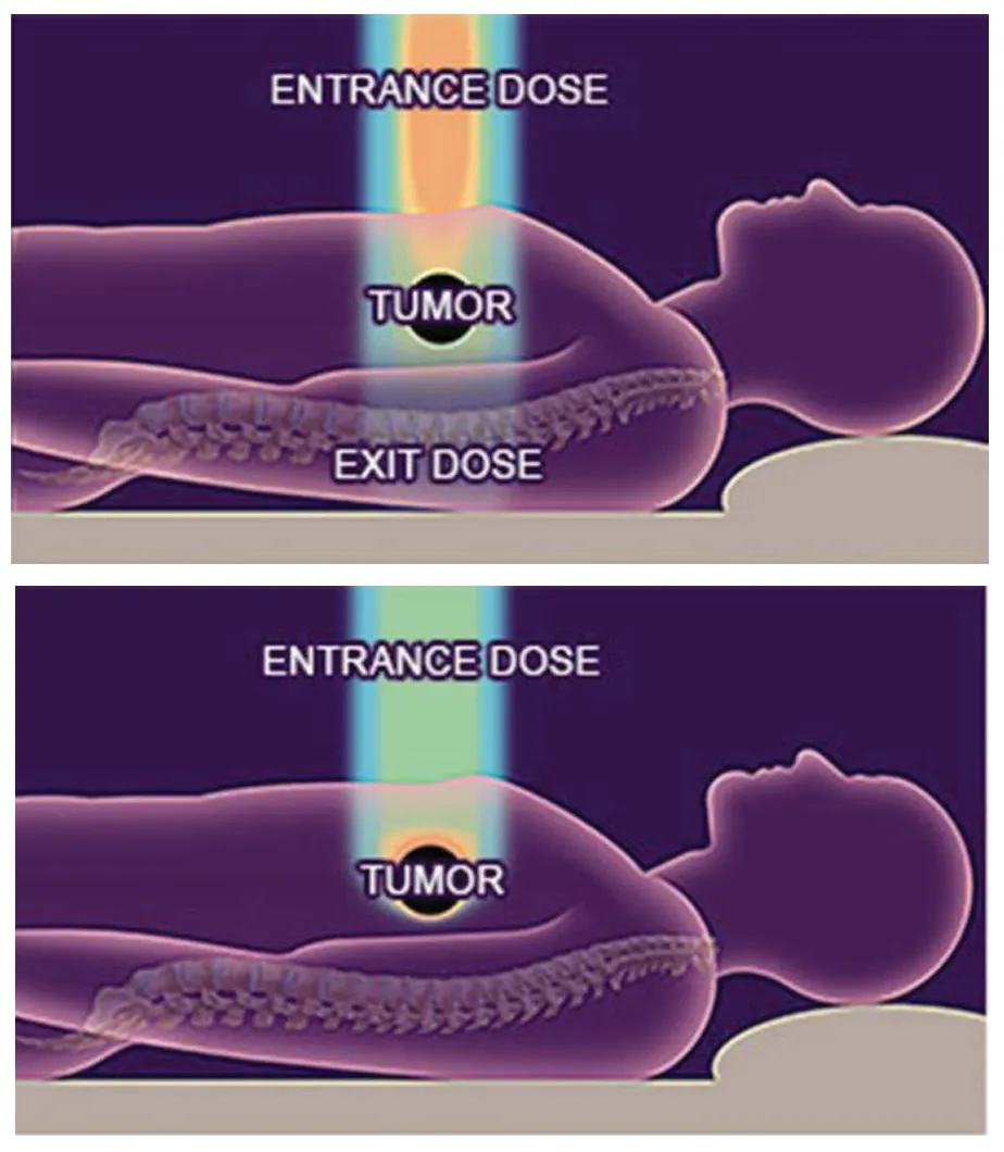 此前的放疗技术,如X射线和伽马射线放射治疗,使用光子杀灭肿瘤细胞。但光子射线穿过人体时,肿瘤前后的正常细胞都会受到相当严重的损伤,射线到达肿瘤本体时,力度也大为减弱。
