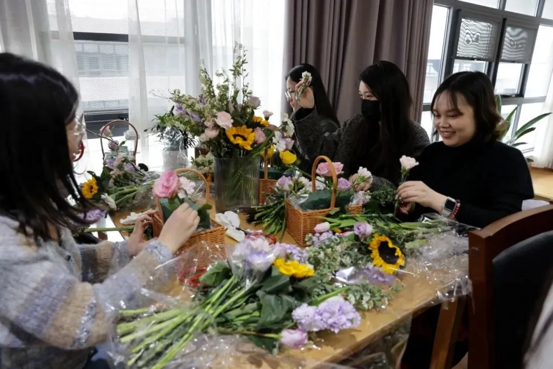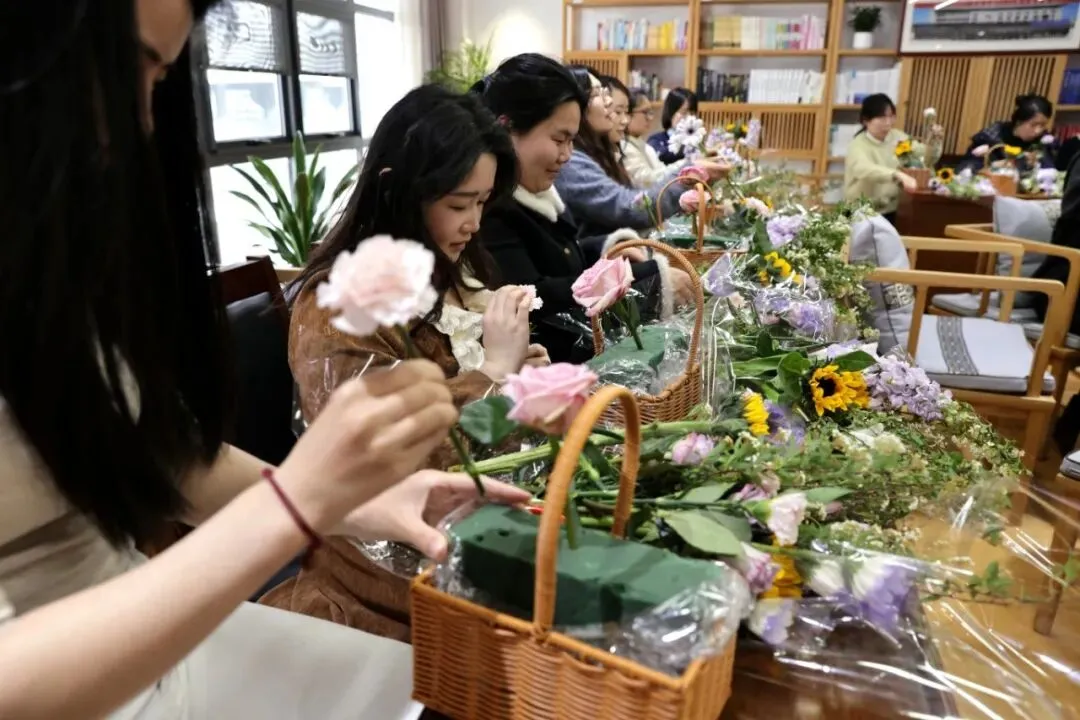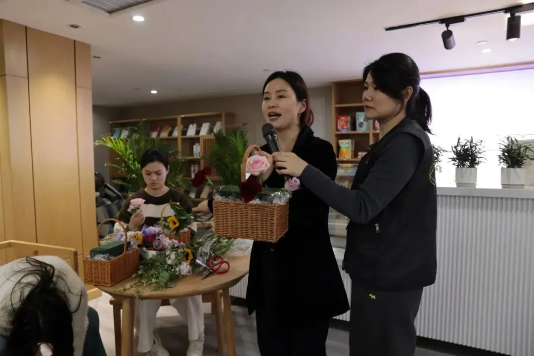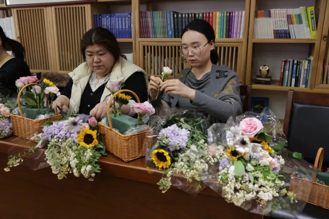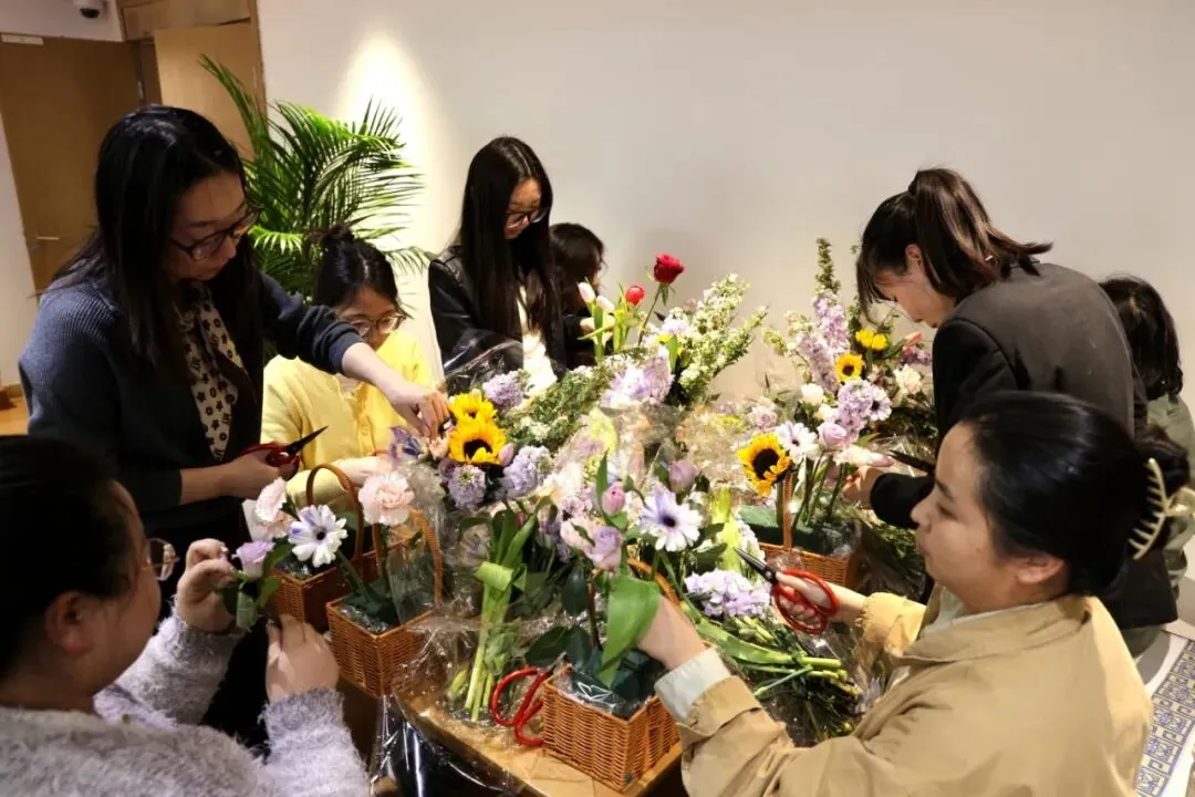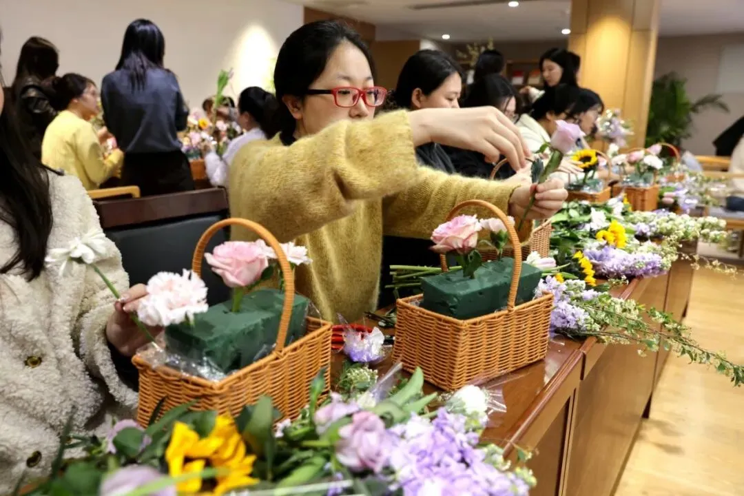 大家边制作边交流心得,在轻松愉悦的氛围中放松身心、增进情谊,一件件错落有致、清新雅致的花艺作品相继成型,现场欢声笑语不断。