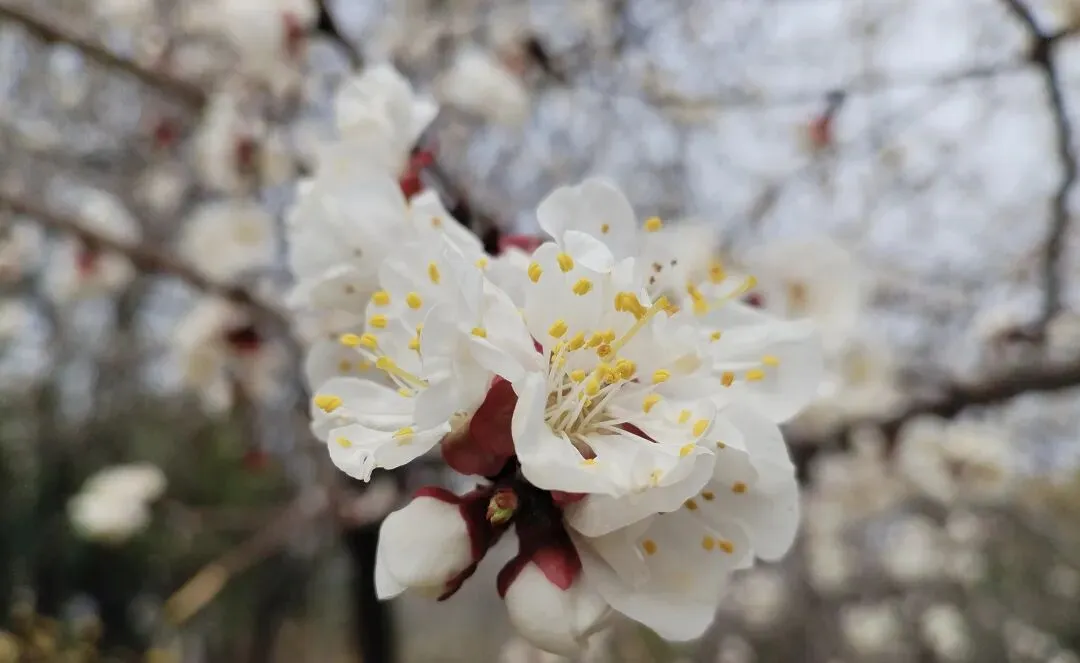 还在公交车上,远远的就能看到白的红的,一片片的花海了。进入园子,湖边,垂柳依依,芽儿初发,瞬间有了烟雨江南的美好。