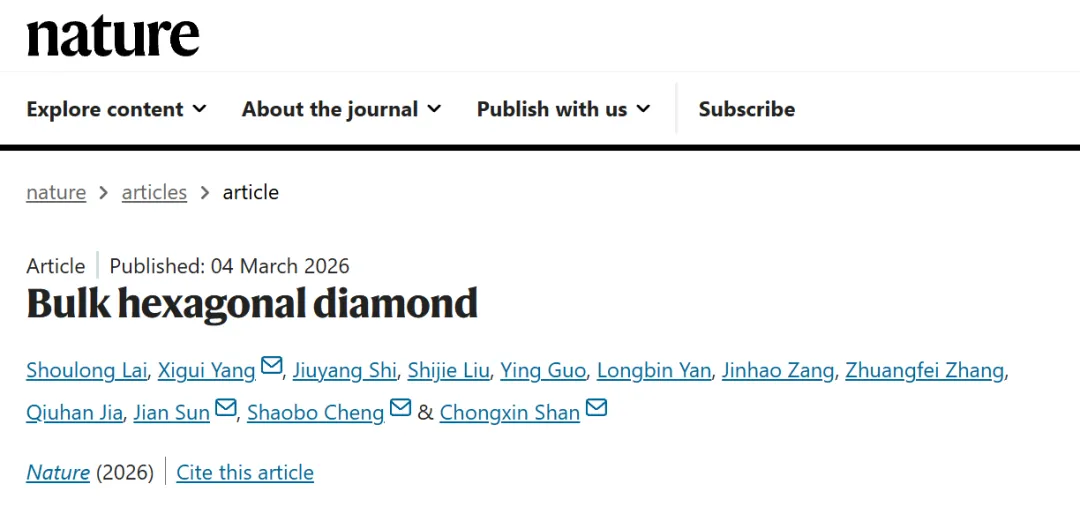 2026年3月5日,郑州大学单崇新教授、杨西贵教授、程少博教授联合南京大学孙建教授团队在国际学术期刊《自然》(Nature)上发表题为“Bulk hexagonal diamond”研究论文,团队成功合成出纯相六方金刚石块材,并精确解析了其晶体结构,揭示了全新的相变机制。