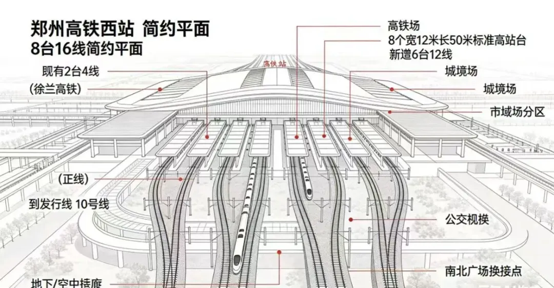 想要撑起8台16线的格局,至少要接入4条铁路线路。目前只有郑西高铁在运营,未来还有望引入郑银高铁、郑洛城际,以及南北向轨道线。不过最终线路如何排布,还要以官方正式批复为准。