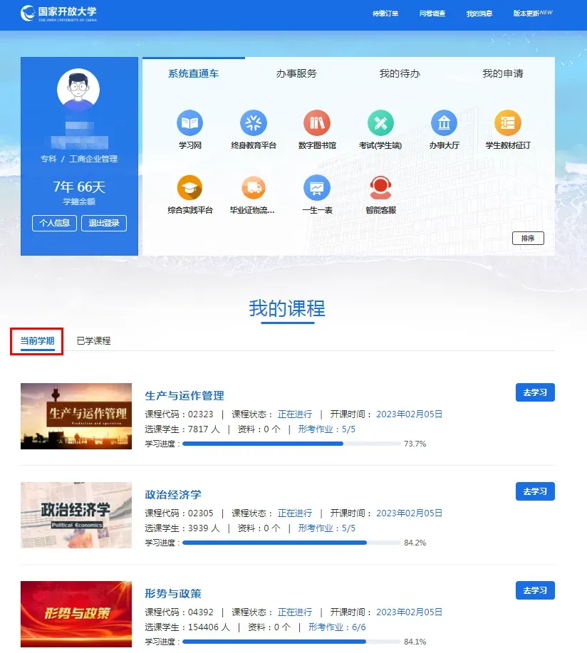 查询到学籍后,就可以开始网上学习+期末考试,一年2学期,网上学习,共5学期。