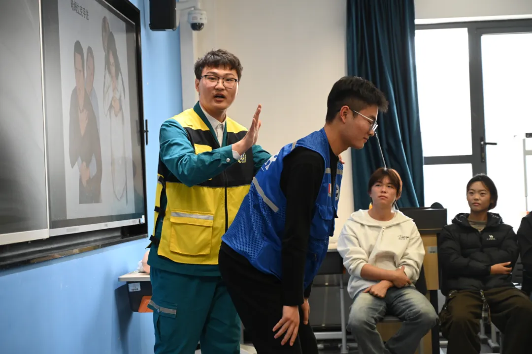 徐奥杰首先讲解了急救的基础知识:如何正确拨打120?心肺复苏术操作要领、气管异物梗阻处理、AED使用等。
