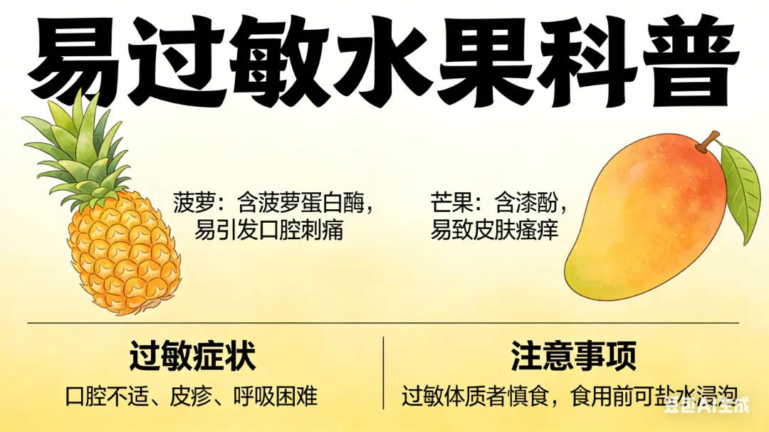 菠萝、芒果、猕猴桃等属于易过敏水果,孕期身体免疫力较弱,食用后可能出现皮肤瘙痒、红肿,甚至呼吸困难等过敏反应,影响自身和胎儿健康。首次食用需少量尝试,无不适再适量食用。