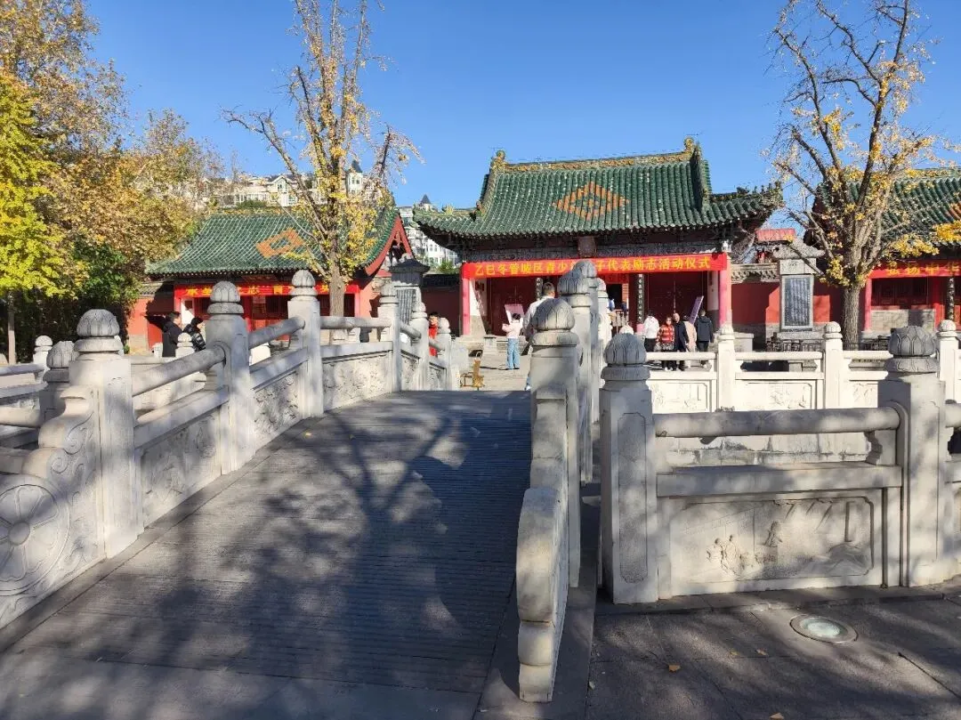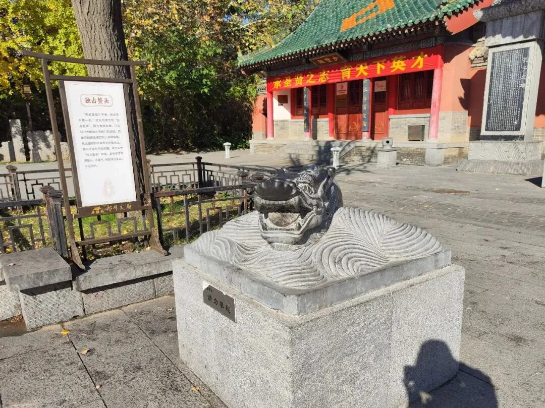 商城遗址城墙下有郑州文庙,大成门正对着东大街,门前是宽阔的广场。广场上修有泮池和泮桥,桥边的“独占鳌头”雕塑,龙头被无数学子摸过,已经包浆。站在桥上,只见大成门的门楼铺绿色琉璃瓦,单檐歇山顶,造型古朴。