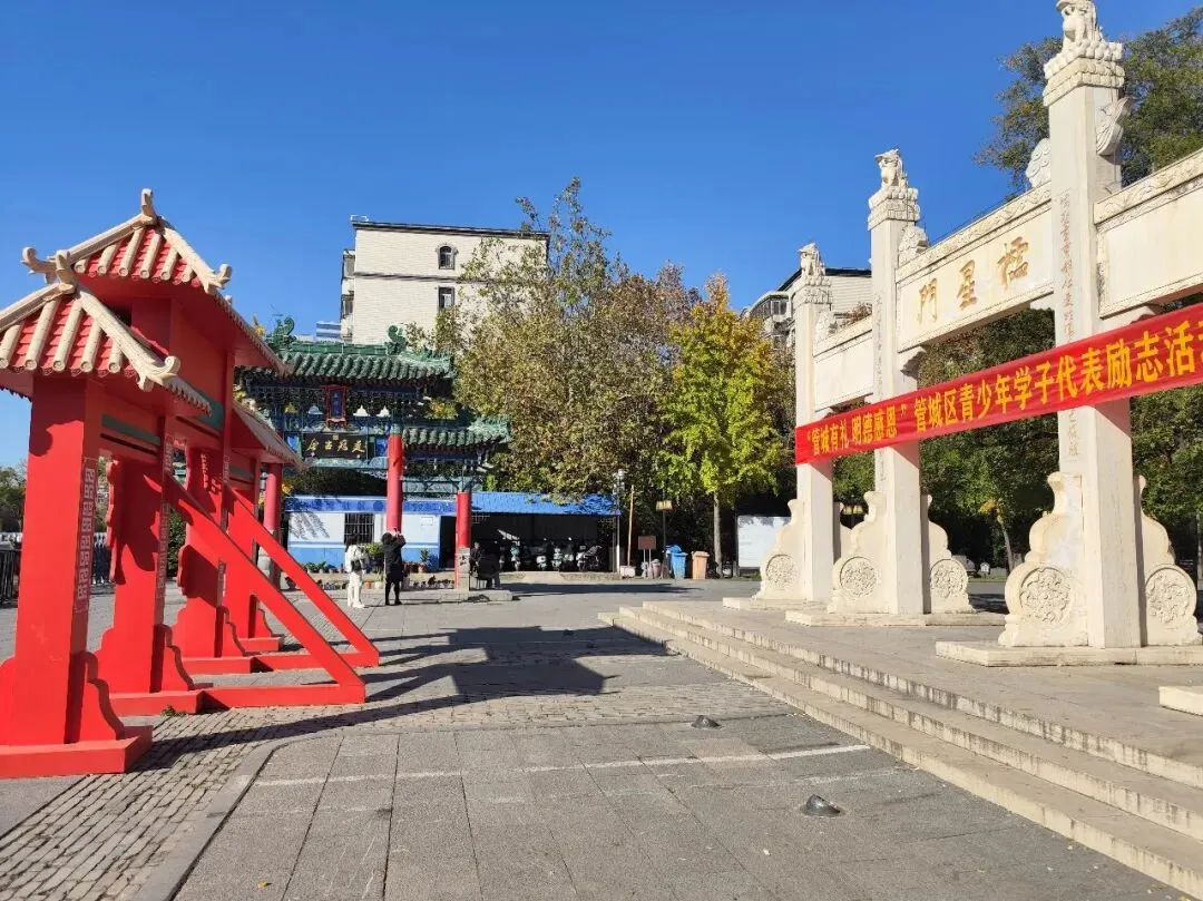 出大成门,回到泮池外的广场,靠近东大街处,还立有棂星门,为石质牌坊。棂星门前,有一座牌坊样子的装饰,上面有“鱼跃龙门”的文字,表达当地民众对学子的期待。棂星门旁还立着一座牌坊,名为金声坊,上方悬挂“德配天地”匾额,是人们对孔子的赞美之辞。