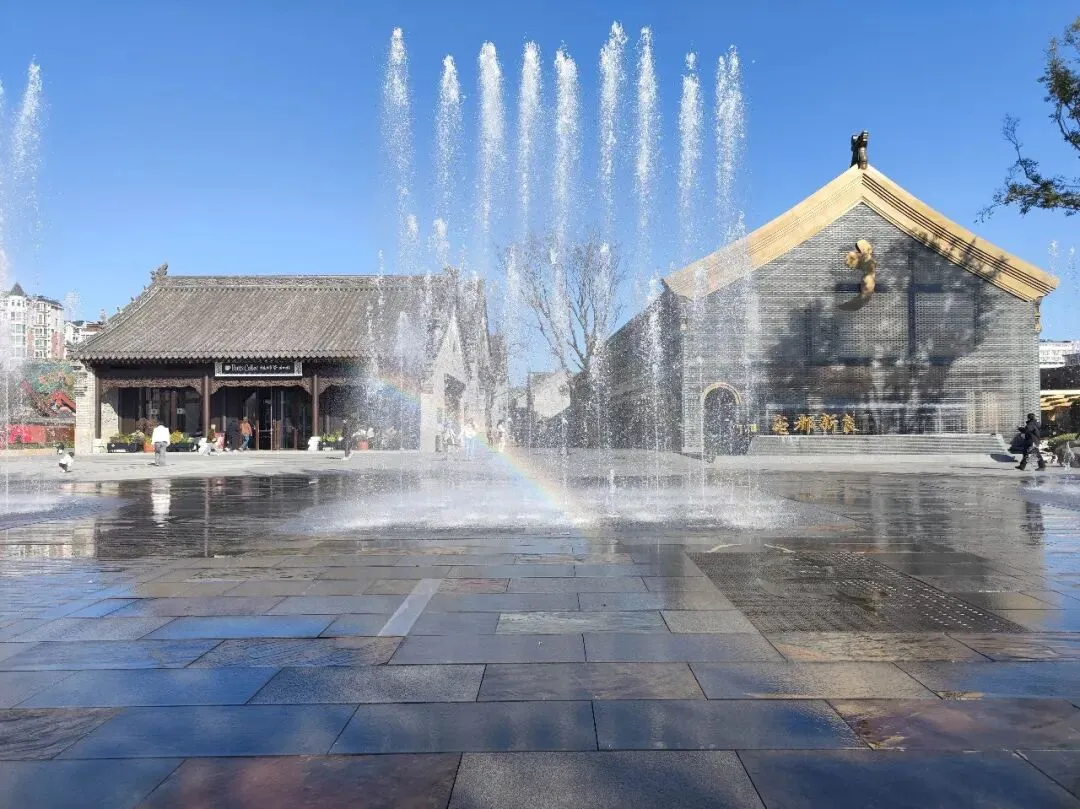 文庙的东侧,为青砖灰瓦的仿古建筑,取名亳都新象,是依托郑州商城遗址开发的商业街区,环境优雅。广场上的喷泉正喷射着水柱,在阳光的映照下,一道彩虹出现在眼前,背后是湛蓝的天空,这场景简直美不胜收。