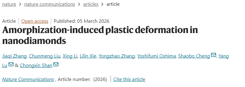 金刚石由sp³共价碳键组成,以其卓越的硬度、热导率和宽禁带等特性而闻名,然而其本征脆性严重限制了变形和加工能力。金刚石长期以来被认为是不可变形的最硬天然材料,这主要归因于其强方向性的C-C sp³共价键。尽管金刚石在力学、光电子、生物医学和光子学等领域具有广泛应用前景,但高脆性和几乎不可变形的特性严重制约了其潜在应用。在块体和亚微米尺度上,材料的塑性变形通常由位错的产生和迁移主导;而在纳米尺度上,材料通常表现出低位错密度,在某些情况下甚至因位错从表面逃逸而完全不存在缺陷。此前研究表明,当金刚石尺寸减小到几百纳米时,可以发生弹性和塑性变形,但其塑性变形机制仍主要由位错的产生和运动控制。对于亚10纳米尺度的材料,其塑性变形行为和机制预计会偏离块体和亚微米尺度观察到的现象,这为探索新型变形机制提供了重要平台。