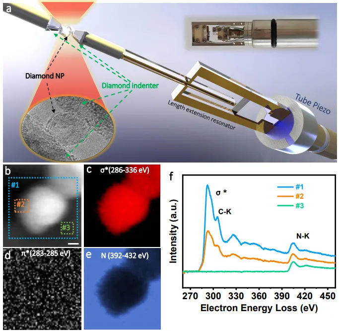 在这项研究中,研究人员利用自主设计的原位透射电子显微镜力学样品杆,在室温下对亚10纳米金刚石纳米颗粒进行了力学实验,发现了非晶化介导的超大塑性变形现象。研究团队通过爆炸法制备了直径小于10纳米的金刚石纳米颗粒,并使用王水清洗以确保纯度。实验采用频率调制方法测量纳米颗粒的刚度,通过耗散能分析识别塑性变形。结果表明,纳米金刚石可被压缩至接近单原子层厚度,压缩应变超过90%而不断裂。这种塑性变形由相互连接的非晶碳网络的形成所主导,该网络能够容纳应力并实现晶粒的协同旋转和滑动,而非传统的位错运动或晶相转变机制。研究还发现明显的尺寸依赖性转变:仅在直径小于约13纳米的纳米金刚石中发生超大塑性变形,而较大的金刚石则以脆性方式变形。分子动力学模拟进一步证实了实验观察到的非晶化介导的塑性变形机制,显示非晶碳形成连续的超薄层,将晶域分割成纳米晶粒。