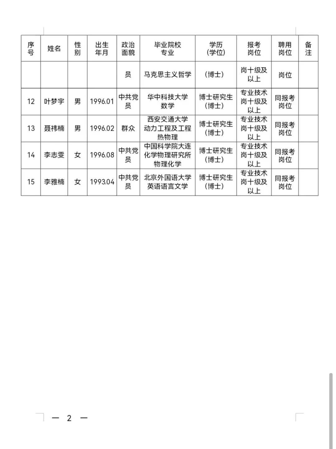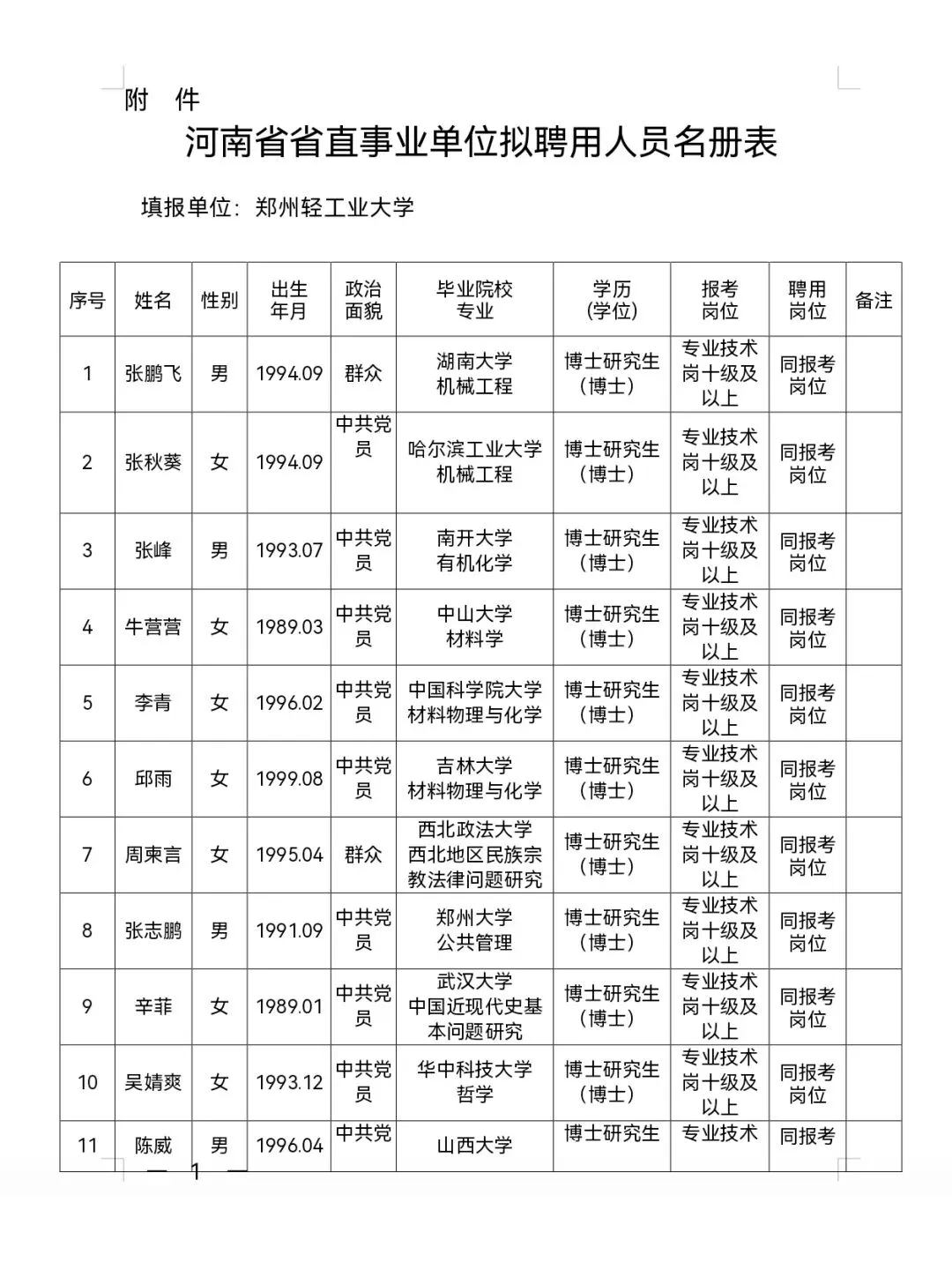 按照《郑州轻工业大学2025年度公开招聘高层次人才工作方案》的有关要求,我校认真组织了2025年度公开招聘高层次人才工作,通过报名、资格审查、面试、体检和考察等环节,确定拟聘用人员15人,现予以公示。公示时间:2026年3月3日-2026年3月11日联系电话:0371-86608209(学校人事处)监督电话:0371-86608112(学校纪委)附件:河南省省直事业单位拟聘用人员名册表