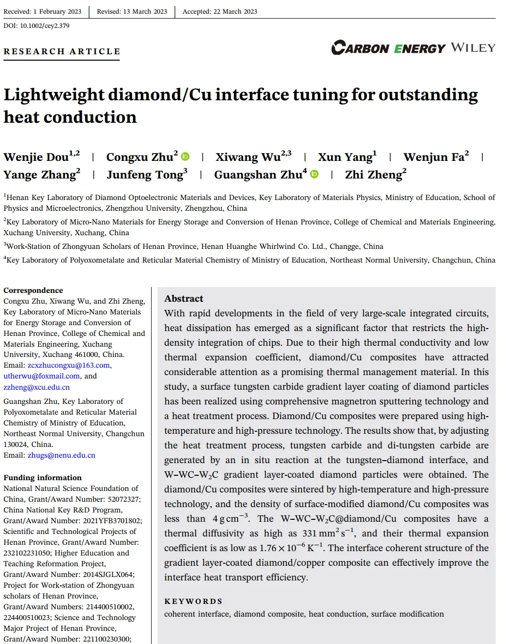 论文标题:Lightweight diamond/Cu interface tuning for outstanding heat conduction