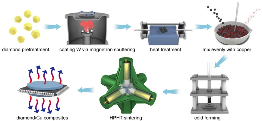 超大规集成电路发展要求散热材料兼具高导热、低膨胀和轻量化特性。金刚石虽具有极高热导率(>1200 W·m⁻¹·K⁻¹),但其与铜的界面能高、润湿性差,导致界面热阻巨大。传统方法如金属基质合金化或金刚石表面金属化虽能改善界面结合,但常牺牲基质热导率或涂层均匀性。本研究提出采用磁控溅射技术在金刚石表面沉积钨涂层,通过热处理形成W-WC-W₂C梯度层,利用高温高压烧结制备复合材料,实现界面声子-电子高效耦合。